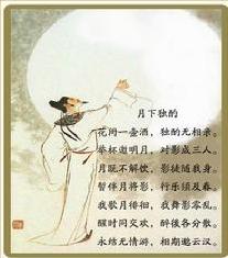 诗篇描写月下独酌情景。月下独酌,本是寂寞的,但诗人却运用丰富的想像,把月亮和自己的身影凑合成了所谓的「三人」。又从「花」字想到「春」字,从「酌」到「歌」、「舞」,把寂寞的环境渲染得十分热闹,不仅笔墨传神,更重要的是表达了诗人善自排遣寂寞的旷达不羁的个性和情感。