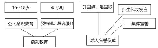 答:活动分为前期教育和成人宣誓仪式两部分。前期是对16-18 岁中学生进行公民意识教育并完成48 小时预备期志愿者服务活动。完成前期教育后举行宣誓仪式, 仪式依次安排三项活动:升国旗、唱国歌,师生代表发言,集体宣誓。 ( 内容完整、表述准确,4 分;表达连贯,2分)