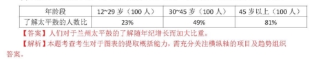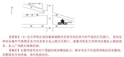 2016年兰州市初中毕业生学业考试语文试题 一、 语言积累与运用(30 分) 1.下列词语中,加点字的读音完全正确的一项是( 3 分 ) A.孕育(yùn) B.冗杂(rǒng) C.招徕(lái) D.恻隐(cè) 【解析】:A 项应是叱咤(zhà)风云 B 项应是锃(zèng)亮 C 项应是相形见绌(chù) 2.下列各句中,加点成语使用有误的一项是(3分 ) A.小草虽然是微不足道的角色,它却以顽强的生命力为世人所钦佩和赞颂 。 B.曹文轩的许多作品都会把关注的重点放在一些小巧玲珑的生活细节上 。 C.他们两人的爱好、处事方法迥然不同。谁也没法了解谁,谁也没法改变谁 。 D.传说中开天辟地的盘古,只是众神之一,影响不大,从未享受过顶礼膜拜的待遇 。 【答案】B [ 【解析】:B 项"小巧玲珑"的"小巧"意为小而灵巧,"玲珑"意为精巧细致。"小巧玲珑"形容东西小而细致。句中用来形容细节,对象不符。 3.下面两个语段都出自杨绛的散文《老王》,根据语境,在 (甲) ,(乙) ,两处填写标 点符号,正确的一项是(3 分) 语段一:有一天傍晚,我们夫妇散步,经过一个荒僻的小胡 同,看见一个婆婆落落的 大院,里面有几间塌败的小屋(甲)老王蹬着他那辆三轮车进大院去。( 画线语的大院, 里面几间败小屋句是对"我们夫妇"在"荒僻的小胡同"看到的两个场景的描述。) 语段二:我谢了他的好香曲,谢了他的大鸡蛋,然后转身进屋去.他赶忙止住我说 :" 我 不 是 要 钱 · " 我也赶忙解释:"我知道,我知道(乙)不过你既然来了,就免得托人捎了。 ( 画线语句 是从说一我, 知道老王不要钱" 转换到说"老王来了,我就不用捎钱 了 " 。) A.(甲) 破 折 号 C.(甲) 破 折 号 【答案】B 【解析】【甲】处句意完结,下一句和上一句无环境、动作的明显衔接,且并未有明显的解释说明或者引出之意,所以用分号不用引号。 【乙】处句意完整且完结,下一句和上一句无句意衔接,且并未有明显的解释说明或者引出之意,所以用句号不用引号。 4.下 列各句中,没有语病的一句是(3 分) A. 能否顺利开展大课间活动,也是提高学生身体素质的重要保障条件 。 B. 记者探访多家药店发现,部分药品价格上调 ,大多数药品价 格保持稳定 。 C. 敦煌市承办首届丝路文賻会的各个展馆都在改善建设及改造的进度。 D. 吉利公司推出的首款电动车"知豆 DI"初步定价大约在 4 至 6 万元左右。 【答案】B 【解析】A 项是两面对一面的错误,能否开展活动包含"能开展"和"不能开展"两方面内容,只有"能开展活动"才"是提高身体素质的条件","不能开展活动"不能"是提高身体素质的条 件"。应去掉"否"或在"提高"前加"能否"。 C 项是谓宾搭配不当的错误,无法"改善""进度"。可将"改善 "改为"加快"。 D 项是语意重复的错误,"大约"与"左右"意思重复,应删去任意一个。 5.结合《童年》一书的阅读,回答问题。(3 分) 我又撤到外祖父那里. 怎么啦,小强盗?他用手敲着桌子,迎面对我说现在我不养你了,让外祖母齐你吧!" "让我养我就养,"外祖母说,"你以为这是个什么了不起的难题吗?" "那你就养好了!"外祖父大叫一声,但是马上又安静下来,对我解释道:"我和她完全各过各的了,如今我们样样都是分开的¼¼" 文中的"我"是谁?"我"为什么"叉搬到外祖父那里"了?外祖父是一个怎样的人? 【答案】阿廖沙 因为父亲病死暴躁 6.综台性学习(8 分) 某班开展"走近兰州太平鼓"综合性学习活动,请你与并完成以下任务。 (1)请阅读为专题板报准备的三则材料,概括材料的主要信息 3 分) 【材料一】相传,明朝大将徐达西征,九攻兰州城不下,使制造了 3 尺长鼓,内藏兵器,趁正月十五闹元宵之际,让军士扮作"社火"队员入城内,一举破城,赢得太平。从此,百姓年年擂鼓闹喜,祈求太平,并把所擂之鼓称为"太平鼓"。 【材料二】兰州太平鼓舞是群舞,表演时,众多鼓手前纵后跃,左旋右转,时而跳打、 时而举打,起落有序,配合默契,犹如万马奔腾。鼓、钹、锣齐响,如春雷滚滚,声声震天。 【材料三】在兰州本地的社火活动中,人们常常看到,太平鼓的鼓手走到哪里,鼓声和 掌声就跟到哪里."打得好""真带劲"的赞扬声和"再来一次"的呐喊声此起被伏。更有外地来的游客感慨:"这场面,这气势,太震撼了,相机拍不出来,下次带家人一起来看!" 【答案】(1)兰州太平鼓意在擂鼓闹春,祈求太平,其表演形式多样,鼓声震天,获当地人和外地游客高度赞扬。 【解析】本题考查考生对于文字性材料的分析概括能力,三则材料分别讲了兰州太平鼓 的由来和意义,兰州太平鼓的表演形式和鼓声,以及人们对兰州太平鼓的褒赞。需学生提炼大意,组织成句。 (2)下面是"兰州太平鼓"问卷调查表的内容,请用一句话表述你读到的信息。(2 分) ![]() 【答案】人们对于兰州太平鼓的了解随年纪增长而加大比重。 【解析】本题考查考生对于图表的提取概括能力,需充分关注横纵轴的项目及趋势组织答案。 (3)学校将组织学生到北山广场观看兰州太平鼓表演。请根据下面的示意图写一段话告诉同学们怎样从学校前往目的地。(3 分) ![]() 【答案】(3)先从学校出发沿着南湖路向正西方向走至与和平街的交叉路口, 再向北转向 沿着 和平路 朝正北 方向 走至与 北山 路交叉 路口, 接着 向西北 方向 转向沿 着北 山路继 续 走,北山广场就在道路北侧。