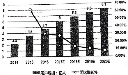 B.从2014年起,移动支付的用户规模稳步增长,预计到2020年同比增长的速度将是201年的两倍多。