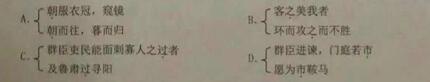 第二部分 阅读与鉴赏(共55分) 三、(4小题,15分) 阅读下面的文段,完成9—11题。(10分) 邹忌讽齐王纳谏 邹忌修八尺有余,而形貌昳丽。朝服衣冠,窥镜,谓其妻曰:“我孰与城北徐公美?” 其妻曰:“君美甚,徐公何能及君也!”城北徐公,齐国之美丽者也。忌不自信,而复问其妾曰:“吾孰与徐公美?”妾曰:“徐公何能及君也?”旦日,客从外来,与坐谈,问之客曰: “吾与徐公孰美?”客曰:“徐公不若君之美也!”明日徐公来,孰视之,自以为不如;窥镜而自视,又弗如远甚。暮寝而思之,曰:“吾妻之美我者,私我也;妾之美我者,畏我也;客之美我者,欲有求于我也。” 于是入朝见威王,曰:“臣诚知不如徐公美。臣之妻私臣,臣之妾畏臣,臣之客欲有求于臣,皆以美于徐公。今齐地方千里,百二十城,宫妇左右莫不私王,朝廷之臣莫不畏王,四境之内莫不有求于王:由此观之,王之蔽甚矣。” 王曰:“善。”乃下令:“群臣吏民能面刺寡人之过者,受上赏;上书谏寡人者,受中赏;能谤讥于市朝,闻寡人之耳者,受下赏。”令初下,群臣进谏,门庭若市;数月之后,时时而间进;期年之后,虽欲言,无可进者。燕、赵、韩、魏闻之,皆朝于齐。此所谓战胜于朝廷。 (选自《战国策·齐策一》) 9.下列句子中,加点词的意义相同的一组是( )(3分) ![]() 【答案】A 【解析】 A早晨; B 主谓之间,取消句子独立性/代词;C 过错/到;D 名词:集市/动词:买 这考查的文言文中的一词多义、虚词的用法、词类活用等知识点,要求学生在备考过程中要善于积累总结这些特殊词语的解释和用法。 10.把“明日徐公来,孰视之,自以为不如”翻译成现代汉语。(4分) 【答案】第二天,徐公到(邹忌家)来,(邹忌)仔细观察了一下,认为自己长得不如徐公好看。 【解析】这句话共有四处得分点:第一处“明日”是第二天的意思,第二处“孰”是仔细的意思,第三处“视”是观察的意思,第四处“以为”是认为的意思。学生在翻译时要做到实词翻译准确,把省略的部分补充完整,特殊句式要符合现代汉语语序用法,语句通顺。 11.下列对文章内容的理解,不正确的一项是 ( ) (3分) A、 虽然邹忌的妻子、小妾、客人都是在夸赞他,但是他们夸赞的原因是不一样的。 B、 邹忌讲究劝说策略,由己及君,设喻说理,巧妙地使齐威王接受了自己的谏言。 C、 齐威王用上、中、下三种不同等级的奖赏来激励大家提意见,取得了很大成效。 D、 齐威王政令刚出,很多人当面谏言,后来则间接提建议,一年后无人再进谏了。 【答案】D 【解析】“间”是偶尔的意思,表示偶尔有人进谏,此句理解错误。 12.阅读下面这首古诗,然后回答问题。(5分)饮酒(其五) 陶渊明 结庐在人境,而无车马喧。问君何能尔?心远地自偏。采菊东篱下,悠然见南山。山气日夕佳,飞鸟相与还。此中有真意,欲辨已忘言。 (1) 诗中的“结庐”“日夕”是什么意思?请选择一个回答。(2分) 【答案】构筑房舍;傍晚 (2) “飞鸟相与还”描写了什么样的情景?表现出诗人怎样的心情?(3分) 【答案】在美好的黄昏景色中,飞鸟结伴返回山林,万物自由自在,适性而动,表达了诗人摆脱官场束缚,悠然自得、恬淡舒适的心情。 【解析】这是古诗鉴赏常见题型,赏析句子并体会作者思想感情。答题思路为:用准确通顺的语言翻译诗句+作者思想感情把握; 学生在备考过程中不能只着眼背诵,要认真对古诗进行理解分析,从每一个词语到每一句诗句再到从整体把握作者的情感,都不能放过。对于思想感情的把握可以在理解诗句,了解作者生平的基础上结合具体诗句分析。
