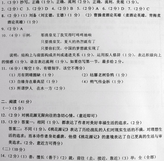 22.概括选文主要内容。(2分) 23.结合选文,分析巴图大爷的形象。(3分) 24.品味下列句中加点词语的妙处。(4分) (1)水池周围, 那湿漉漉的泥土上,长着丛丛小草,还开放着朵朵小花,美极了。(2分) (2)大家便同时趴在地上,将嘴伸进水池——瞧,这个喝水法,够“野”了吧!(2分) 25.从修辞角度赏析第②段画线句子。(3分) 盛夏的中午,天空无语,只有太阳像一盆燃旺的炭火,暴烤得每颗沙粒都在狂跳,甚至发出吱吱的脆响声。 26.“野马嘴里有清泉。”假如你身处生活的“沙漠”,没有“野马”作向导,你将怎样寻找“清泉”?联系生活实际谈谈你的想法。(4分) 三、作文(50分) 27.题目:家有 要求:①把题目补写完整。 参考答案 ![]() 假使 15.C ![]() 四、16分 22.(2分)选文记叙了我们在巴图大爷的带领下追寻野马的足迹,在沙漠中找到水源的故事。(要有人物、地点、经过、结果,否则酌情扣分〉 23.(3分〉巴图大爷是一个沉着(冷静\乐观、有耐心(坚持不懈〉、阅历丰富、有智慧的老人。〔答对任意二点2分,结合选文分析1一2处1分’意近即可) 24.〈4分〉(1)“美”字不仅表现出在清泉滋润下小草、小花的勃勃生机,而且表达出我们千辛万苦找到水源时的惊喜心情。〖2分,一个要点1分,意近即可) (2)“野”字不仅表现出我们因干渴之极而无拘无束喝水的样子,而且表达出作者对充满野性的生存状态、生活方式的赞美。〔2分,一个要点,1分,意近即可〕 25.(3分)选句运用了比喻、拟人、夸张的修辞手法,生动形象地写出了天气的炎热(环境的恶劣〉,表达出我们烦躁不安的心情。(答出二种修辞1分,其余两个要点各1分,“生动形象”扣1分,其它情况酌情给分) 26.(4分)有希望,我们的生命就有力量的源泉。身处生活的“沙漠”,即使没有“野马”作向导’只要我们沉着、乐观、有耐心……就一定能找到生命的“淸泉”。(扣住文章意旨,2分;结合生活实际,1分,语言组织,1分。意近即可) 27. 作文略