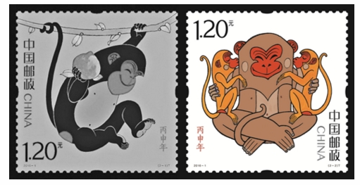 【链接材料】1980年,黄永玉设计了我国第一枚生肖邮票——猴票。时隔36年,黄永玉再次执笔,为丙申猴年设计了两枚猴票:左边这枚寓意为“捧桃献瑞”,右边这枚寓意为“合家欢乐”。