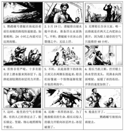 二、文言文阅读(共9分) 阅读《三峡》,完成7—10题。 三峡 郦道元 自三峡七百里中,两岸连山,略无阙处。重岩叠嶂,隐天蔽日。自非亭午夜分,不见曦月。 至于夏水襄陵,沿溯阻绝。或王命急宣,有时朝发白帝,暮到江陵,其间千二百里,虽乘奔御风,不以疾也。 春冬之时,则素湍绿潭,回清倒影。绝巘多生怪柏,悬泉瀑布,飞漱其间,清荣峻茂,良多趣味。 7.解释下列语句中加点词的意思。(2分) (1)沿溯阻绝溯:________ (2)属引凄异属:________ 8.用现代汉语翻译下列句子。(2分) (1)自非亭午夜分,不见曦月。 (2)虽乘奔御风,不以疾也。 翻译:________ 9.阅读文中画线的语句,发挥你的想象,用自己的话描述“清荣峻茂”在脑海中呈现出的是怎样一幅画面。(3分) 10.请你从下面两题中任选一题作答 (2分) (1)上文描绘了三峡的景色。说到三峡,你会想到的古诗句是________,________。 (2)当你眼前呈现出长江宽阔的江面上帆船航行的景象时,想到的古诗句是 ________,________。 三、名著阅读(共10分) 11.下面是《论语》中的九则语录,其中有论述学习的,有论述治国之道的,也有论述其他内容的。请你将论述学习和治国之道的语录分别都挑出来。(只填序号) ①子日:“学而不思则罔,死而不学则殆。” ②子日:“道千乘之国,敬事而信,节用而爱人,使民以时。” ③子日:“君子周而不比,小人比而不周。” ④子日:“不患人之不己知,患不知人也 。” ⑤子日:“温故而知新,可以为师矣” ⑥有子曰:“ 礼之用,和为贵。先王之道,斯为美。小大由之,有所不行。知和而和,不以礼节之,亦不可行也。” ⑦子曰:“为政以德,譬如北辰居其所而众星共之。” ⑧子曰:“由!诲女知之乎!知之为知之,不知为不知,是知也。 ⑨子曰:“巧言令色,鲜矣仁。” 论述学习的语录:_____________ 论述治国之道的语录:______________ 12.《朝花夕拾》是鲁迅的一部回忆性散文集,其中有些作品记录了他童年和少年时期的生活,在这些作品中,鲁迅描写了给他留下深刻印象的人物,如《阿长与<三海经>》中的阿长,《从百草屋到三味书屋》中的__①__,又如《 ② 》中的__③_。(3分) 13.(1)连环画讲述的是鹦鹉螺号潜艇在前往南极路上的一次遇险经历。从连环画的内容来看,当破冰遇到困难时,尼摩船长想到的解决办法是① 。在《海底两万里》一书中。尼摩船长拯救鹦鹉螺号或他人生命的事情还很多,比如在遇到 ② 的险情时,尼摩船长③ ,化险为夷。(3分) (2)根据前8幅画的内容,为第9幅画补写一句话。(2分) ![]() 答: