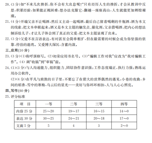 四、作文(60分) 25.请以“生命的意义在于人与人之间的互相照亮”为主题,自拟题目,写一篇不少于600字的文章。 要求:文体不限,不得抄袭,不得出现真实的姓名、学校等敏感信息。 ![]() ![]() 答案: (1)称呼顶格写。初荣应用书名号。“编辑工作对我”应改为“我对编辑工作”。(把“收稿”调整到“审稿”前。) (2)与人沟通能力、组织能力、团结协作意识强;工作态度端正,执行力强;熟练运用办公软件。 (3)在平凡与煎熬的日子里,不要忘了在偌大的世界偶然的遇见;小巷的夜曲,乡间的稻香,雪中的寒梅,乌云后的星光……美好与你环环相扣,人与人心心照亮。
