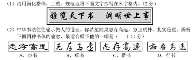 2020年海南中考语文真题 一、基础知识与运用(15分) 1.中华书法历史悠久,博大精深。请欣赏下面的书法作品,按要求答题。(3分) (1)请用简化楷体,工整、规范地将下面文字抄写在米字格内。(2分) ![]() (2)中华书法往往喻示做人的道理。你希望同桌志存高远,方正质朴,扎实稳重。辨析下面四种书体的喻意,最适合赠予他的一幅是( )(1分) 2.阅读下面语段,按要求答题。(8分) 自贸春风劲,乡村显风采。“金山银山不如绿水青山”,在新的发展机遇面前,海南的乡村建设将更显独特优势。 你看,牙寒古黎村,那深深浅浅的绿色在田间尽情挥洒,弯弯曲曲的小路向村落中延伸,错落有致的屋舍掩映在槟榔丛中。好客的村民,淳朴的民风,热气腾腾的生活,一切都那么美好tián( )静,构成一幅风格清新、令人 ① (A.心旷神怡 B.栩栩如生)的水彩画。若是清晨,云雾在远远近近的山岭缭绕,飘飘荡荡,山岭 ② (A.历历在目 B.若隐若现)。小山村上空chuī( )烟袅袅,飘出阵阵柴草的香气,响亮的鸡鸣划破湿润的空气,在山岭间回荡。村旁路边的草丛间,山泉水哗啦啦,昼夜不息。不知名的鸟儿在林间叽叽喳喳唱着欢乐的歌儿……牙寒古黎村,山灵水秀,生活和美,一定是你心中的向往! (节选自《系列人文与地理资料》,有删改) (1)给文段中加点的字注音,或根据拼音写汉字。(4分) ①挥洒 ②tián( )静 ③chuī( )烟 ④回荡 (2)结合语境选择恰当的成语,将字母序号填写在相应的位置上。(2分) ① ② (3)仿照画线句子,拟写一句宣传语,向国内外游客介绍牙寒古黎村。(2分) 3.阅读下面的消息,按要求答题。(4分) 本报海口3月28日讯(记者刘操)白衣执甲,英雄凯旋。3月28日下午,在圆满完成支援湖北各项任务后,海南支援湖北抗疫前方指挥部和第六、第七批医疗队共368人从武汉乘包机抵达海口,省委书记刘赐贵到机场迎接医疗队凯旋。 (节选自《海南日报》) (1)请用一句话概括以上消息的主要内容。(2分) (2)下面是复兴学校陈帅同学以学生会名义起草的一封感谢信,其中有两处错误,请按要求帮助他修改。(2分) ![]() ①文中画线句A有语病,请在横线上修改。(1分) ②文中画线句B表达不得体,请在横线上修改。(1分) 二、名著阅读(5分) 4.阅读下面的名著选段,按要求答题。 这可绝不是件容易的事。一年,两年,至少有三四年:一滴汗,两滴汗,不知道多少万滴汗,才挣出那辆车。从风里雨里的咬牙,从饭里茶里的自苦,才赚出那辆车,那辆车是他的一切挣扎与困苦的总结果与报酬,像身经百战的武士的一颗徽章。在他赁人家的车的时候,他从早到晚,由东到西,由南到北,像被人家抽着转的陀螺;他没有自己。可是在这种旋转之中,他的眼并没有花,心并没有乱,他老想着远远的一辆车,可以使他自由,独立,像自己的手脚的那么一辆车。 (1)文段节选自我国现代著名作家老舍的小说 。(2分) (2)下面是王亮同学阅读本段所做的批注,其中理解不正确的一项是( )(3分) A.主人公有自己的理想和追求,向往自由和独立的生活。 B.主人公怀揣梦想,风里来雨里去,历经千辛万苦,终于挣到了属于自己的车。 C.作者善用比喻,生动形象地写出主人公生活的艰辛以及那辆车对他的意义。 D.选段语言幽默风趣,具有辛辣的讽刺意味,所刻画的人物让人忍俊不禁。 三、古诗文积累与阅读(25分) (一)古诗文名句默写(8分) 5.(1) ,大庇天下寒士俱欢颜!(杜甫《茅屋为秋风所破歌》) (2)落红不是无情物, 。 (龚自珍《己亥杂诗》(其五)) (3) ,自缘身在最高层。 (王安石《登飞来峰》) (4)富贵不能淫,贫贱不能移, 。 (《孟子·富贵不能淫》) (5)在“美丽乡村”建设中,即将退休的驻村干部李辉埋头苦干,面对别人“一把年纪,何必拼命”的劝说,他用李商隐《无题》中的诗句“ , ”表明心志。 (6)2020年是脱贫攻坚年,心持“ , ”情怀的优秀共产党员奔赴乡村,为兑现“脱贫路上一个都不能少”的庄严承诺而奋斗(用范仲淹《岳阳楼记》中的名句填空)。 (二)古诗词阅读(5分) 闻王昌龄左迁龙标遥有此寄 (唐)李白 杨花落尽子规啼,闻道龙标过五溪。 我寄愁心与明月,随君直到夜郎西。 5.诗的前两句中“ ”和“ ”两样景物点明事情发生的时节,富有象 征意义,给人以画面感。(2分) 7.“我寄愁心与明月,随君直到夜郎西”这两句诗在情感的表达上有何独特之处,请简要赏析。(3分) (三)文言文阅读(12分) 阅读下面文言文选段,按要求答题。 甲 虽有佳肴,弗食,不知其旨也;虽有至道,弗学,不知其善也。是故学然后知不足,教然后知困。知不足,然后能自反也;知困,然后能自强也。故曰:教学相长也。《兑命》曰:“学学半”,其此之谓乎! (选自《<礼记>二则》) 乙 子曰:“三人行,必有我师焉。择其善者而从之,其不善者而改之。”(《述而》) 子曰:“知之者不如好之者,好之者不如乐之者。”(《雍也》) 曾子曰:“吾日三省吾身:为人谋而不忠乎?与朋友交而不信乎?传不习乎?”(《学而》) (选自《<论语>十二章》) 8.解释下列加点字的意思。(4分) (1)不知其旨也(2)《兑命》曰:“学学半” (3)知之者不如好之者(4)传不习乎 9.将下面句子翻译成现代汉语。(4分) (1)故曰:教学相长也。 (2)与朋友交而不信乎? 10.比较甲、乙两段中的画线句,说说这两句论述的侧重点有什么不同。(2分) 11.班级召开“学会反思”主题班会,你代表小组发言,请从甲、乙两文中选一句作为你发言的论据写在横线上。(2分)