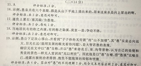 愚溪诗序 [唐]柳宗元 灌水之阳,有溪焉,东流入于潇水。或曰:冉氏尝居也,故姓是溪为冉溪。或曰:可以染也,名之以其能,故谓之染溪。余以愚触罪,谪潇水上。爱是溪,入二三里,得其尤绝者家焉。今予家是溪,而名莫能定,土之居者,犹龂龂然,不可以不更也,故更之为愚溪。 愚溪之上,买小丘,为愚丘。自愚丘东北行六十步,得泉焉,又买居之,为愚泉。愚泉凡六穴,皆出山下平地,盖上出也。合流屈曲而南,为愚沟。遂负土累石塞其隘为愚池。愚池之东,为愚堂。其南,为愚亭。池之中,为愚岛。嘉木异石错置,皆山水之奇者,以余故,咸以“愚”辱焉。 夫水,智者乐也。今是溪独见辱于愚,何哉?盖其流甚下,不可以溉灌。又峻急,多坻石,大舟不可入也。幽邃浅狭,蛟龙不屑,不能兴云雨,无以利世,而适类于余,然则虽辱而愚之,可也。 (节选自《古文观止》,略改动) 【注释】①灌水:水名;后文“潇水”也是水名。②家:安家。③龂龂(yín yín):形容争辩的样子。④见……于:古代汉语表示被动的一种格式。见辱于愚:被愚这个名称污辱。 15.下列句子中加点词的意思相同的一项是(▲)(3分) A.灌水之阳,有溪焉 本在冀州之南,河阳之北 B.故更之为愚溪 湖中焉得更有此人 C.皆山水之奇者 邑人奇之,稍稍宾客其父 D.大舟不可入也 潭中鱼可百许头 16.用现代汉语写出下面句子的意思。(3分) 愚泉凡六穴,皆出山下平地,盖上出也。 17.用“/”给文中画线文字断句。(限断两处)(2分) 遂负土累石塞其隘为愚池 18.“是溪”“名莫能定”的原因是什么?用简洁的语言概括。(2分) 19.作者文中说自己“愚”,他的“愚”和《愚公移山》中愚公的“愚”有什么不同?请结合文本加以分析。(4分) 参考答案 15.A 16.愚泉共有六个泉眼,都是从山下平地上涌出来的,原来这泉水是向上冒出来的啊! 17.遂负土累石,塞其隘,为愚池。 18.当地居民有的称之为冉溪,有的称之染溪,莫衷一是,争论不休。 ![]() 参考译文 灌水的北面有一条小溪,往东流入潇水。有人说,过去有个姓冉的住在这里,所以把这条溪水叫做冉溪。还有人说,溪水可以用来染色,用它的功能命名为染溪。我因愚犯罪,被贬到潇水。我喜爱这条溪水,沿着它走了二三里,发现一个风景绝佳的地方,就在这里安家。古代有愚公谷,如今我把家安置在这条溪水旁,可是它的名字没人能定下来,当地的居民还在争论不休,看来不能不改名了,所以把它定名为愚溪。 我在愚溪上面买了个小丘,叫做愚丘。从愚丘往东北走六十步,发现一处泉水,又买下来作为积蓄,称它为愚泉。愚泉共有六个泉眼,都在山下平地,泉水都是往上涌出的。泉水合流后弯弯曲曲向南流去,经过的地方就称作愚沟。于是运土堆石,堵住狭窄的泉水通道,筑成了愚池。愚池的东面是愚堂,南面是愚亭。池子中央是愚岛。美好的树木和奇异的岩石参差错落。这些都是山水中瑰丽的景色,因为我的缘故都用愚字玷污了它们。 水是聪明人所喜爱的。可这条溪水竟然被愚字辱没,这是为什么呢?因为它水道很低,不能用来灌溉。又险峻湍急,有很多浅滩和石头,大船进不去;幽深浅狭,蛟龙又不屑于此,不能兴起云和雨,对世人没有什么好处,正像我。既然如此,即使是玷辱了它,用愚字来称呼它,也是可以的。