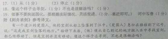 刻舟求剑 楚人有涉江者,其剑自舟中坠于水,遽契其舟,曰:“是吾剑之所从坠。”舟止,从其所契者入水求之。舟已行矣,而剑不行,求剑若此,不亦惑乎! 17.解释下列句子中加点的词。(2分) (1)其剑自舟中坠于水 自: (2)舟止,从其所契者入水求之 止: 18.把文中画线的句子翻译成现代汉语。(2分) 求剑若此,不亦惑乎! 译文: 19.这个故事启示我们___________________________,初中阶段所学的文言故事“___________”也说明了类似的道理。(2分) 参考答案 17从 (2)停止 18.像这个样子去寻剑,不也是很糊涂吗? 19.做事不要拘泥固化,要根据实际情况,灵活变通。 河中石兽 参考译文 有个楚国人渡江,他的剑从船里掉到水中,急忙在船边上刻了个记号,说:“这儿是我的剑掉下去的地方。”船停了,(这个楚国人)从他刻记号的地方下水寻找剑。 船已经前进了,但是剑不会随船前进,像这样找剑,不是很糊涂吗?