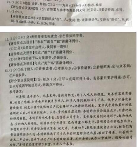 刘善明,平原人。元嘉末,青州饥荒,人相食。善明家有积粟,躬食饘①粥,开仓以救乡里,多获全济。少而静处读书,刺史杜骥闻名候之,辞不相见。宋孝武见其对策强直,甚异之。五年,青州没虏,善明母陷北,虏移置桑乾。善明布衣蔬食,哀戚如持丧②。帝每见,为之叹息,时人称之。转宁朔将军、巴西梓潼二郡太守,善明以母在虏中,不愿西行,涕泣固请,见许。元徽初,遣北使,朝议令善明举人,善明举州乡北平田惠绍使虏,赎得母还。建元二年卒,诏曰:“善明勤绩昭著,不幸殒丧,痛悼于怀。谥烈伯。”善明家无遗储,唯有书八千卷。 (选自《二十四史·南齐书》,有删节) 【注】①饘:zhān稠粥。②持丧:守丧。③见:被。 10.解释下列句中加点的实词。(4分) (1)多获全济() (2)甚异之 () (3)见许 ( ) (4)朝议令善明举人( ) 11.下列加点词的意义和用法都相同的一组是(2分) A.宋孝武见其对策强直 其真不知马也 (《马说》) B.为之叹息 是吾剑之所从坠 (《刻舟求剑》) C.善明以母在虏中 以俟夫观人风者得焉 (《捕蛇者说》) D.痛悼于怀 往来于荒村野水之间 (《治水必躬亲》) 12.翻译下列句子。(6分) (1)善明布衣蔬食,哀戚如持丧。 (2)微斯人,吾谁与归?(《岳阳楼记》) (3)吾妻之美我者,私我也。(《邹忌讽齐王纳谏》) 13.请用四字短语简要概括刘善明的特征。(3分) 参考答案 10. 救助,救济,帮助; 以 为异 允许 推荐,推举 11.D 项 都翻译成“在” ![]() 善明家里没有留下积蓄,只有八千卷书。