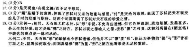 天石砚铭(并序) 【宋】苏轼 轼年十二时,于所居纱縠行①宅隙地中,与群儿凿地为戏。得异石,如鱼,肤温莹,作浅碧色。表里皆细银星,扣之铿然。试以为砚,甚发墨②,顾无贮水处。先君③曰:“是天砚也有砚之德而不足于形耳。”因以赐轼,曰:“是文字之祥④也。”轼宝而用之,且为铭曰: 一受其成,而不可更。或主⑤于德,或全于形。均是二者,顾予安取。仰唇俯足,世固多有。 元丰二年秋七月,予得罪下狱,家属流离,书籍散乱。明年至黄州,求砚不复得,以为失之矣。七年七月,舟行至当涂⑥,发书箧,忽复见之。甚喜,以付迨、过⑦。其匣虽不工,乃先君手刻其受砚处,而使工人就成之者,不可易也。 (选自《苏轼文集》第二册) 【注释】①纱縠行:苏轼故里,在四川眉山。②发墨:指砚台磨墨易筋浓。③先君:这里指苏洵。④祥:吉祥之兆。⑤主:以……为主,着重于。⑥当涂:地名。⑦迨、过:苏迨、苏过,苏轼的儿子。 16.下列各组句子中,加点词语的释义不同的一组是( )(2分) A.得异石 奇山异水,天下独绝 B.且为铭曰 公输盘为楚造云梯之械 C.明年至黄州 越明年,政通人和 D.求砚不复得 求石兽于水中 17.用“/”给文中画线句子断句。(限断两处)(2分) 是天砚也有砚之德而不足于形耳。 18.文中“赐”“付”都是父亲将砚交给儿子,作者在其中寄寓的情感有何异同?(3分) 因以赐轼,曰:“是文字之祥也。” 甚喜,以付迨、过。 19.刘禹锡在《陋室铭》中写道:“斯是陋室,惟吾德馨。”苏轼在砚铭中说:“或主于德,或全于形”,你认为苏轼对“德”与“形”的看法与刘禹锡是否相同?请结合文本简要说明理由。(3分) 参考答案 16、B ![]()