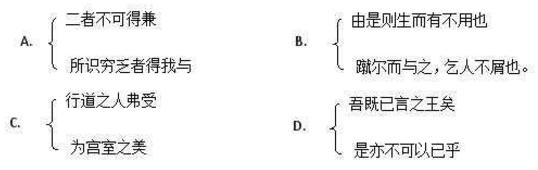 鱼,我所欲也;熊掌,亦我所欲也,二者不可得兼,舍鱼而取熊掌者也。生,亦我所欲也;义,亦我所欲也。二者不可得兼,舍生而取义者也。生亦我所欲,所欲有甚于生者,故不为苟得也。死亦我所恶,所恶有甚于死者,故患有所不辟也。如使人之所欲莫甚于生,则凡可以得生者何不用也。使人之所恶莫甚于死者,则凡可以辟患者何不为也!由是则生而有不用也;由是则可以辟患而有不为也。是故所欲有甚于生者,所恶有甚于死者。非独贤者有是心也,人皆有之,贤者能勿丧耳。 一箪食,一豆羹,得之则生,弗得则死。呼尔而与之,行道之人弗受;蹴尔而与之,乞人不屑也。 万钟则不辩礼义而受之,万钟于我何加焉!为宫室之美,妻妾之奉,所识穷乏者得我与?乡为身死而不受,今为宫室之美为之;乡为身死而不受,今为妻妾之奉为之;乡为身死而不受,今为所识穷乏者得我而为之:是亦不可以已乎?此之谓失其本心。 16.解释下列句子中加点的词。(4分) (1)鱼我所欲也 (2)故患有所不辟也 (3)乡为身死而不受 (4)此之谓失其本心 17.下列句子中加点词的意思相同的一项是(3分) ![]() 18.翻译下列句子。(4分) (1)非独贤者有是心也,人皆有之,贤者能勿丧耳。 (2)万钟则不辩礼义而受之,万钟于我何加焉! 19.作为21世纪的中学生,你怎样理解“义”?请选取两位我国历史上含生取义的人物,简单叙述其事迹。(4分) 参考答案 16.(1)想要的 (2)祸患,灾难 (3)通“向”,从前 (4)天性,天良(每空l分,共计4分) 17.C(3分) 18.(1)不仅贤德的人有这种天性,人人都有。只不过贤德的人能够不丧失罢了。(共2分) (2)对于优厚的俸禄(高位厚禄)不辨别是否合乎礼义就接受了,这样的优厚俸禄(高位厚禄)对我有什么好处呢?(共2分) 19.参考答案;能见义勇为,为正义事业而献身,做于国于民有益的事是“义”。社会上的哥们义气,与小团体、个人私利相关的江糊义气和本文的“义”不同。(2分)我国历史上舍生取义的事例很多,如:唐雎出使秦国,不辱使命;苏武牧羊,不改初心;岳飞抗金,精忠报国;朱自清宁可饿死,也不领美国教济粮。(事例1个1分,共2分)