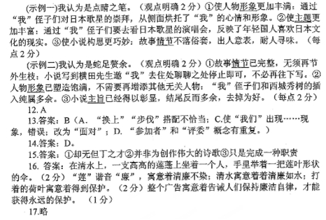 五、写作(60分) 17、阅读下面的材料,根据要求写一篇字数不少于800字的文章。本题由重庆名校资源库 刘薇莉编辑 生活如同一朵玫瑰,每瓣花代表一个梦想,每根刺昭示一种现实。 ——法国作家阿尔弗莱·德·缪塞 自拟标题,自定立意,除诗歌外,文体不限,不要套作,不得抄袭。 参考答案 ![]() ![]()