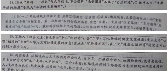 参考答案与解析 1. A(“无不”过于绝对,文中有昂扬生命力的主语为“李白的诗”。) 2.A(文中有提到传统儒学先义后利,理学重义轻利。) 3.C(C选项对于文玩和服饰的推断明显是偏盛唐气象。在第一段有提到“宋型文化则是一种相对封 闭、内倾、色调淡雅的文化类型”。因此宋朝文玩尚朴澹,重意态,而服饰“惟务洁净”,以简朴清秀为推。) 4、B 5.B(孤是君主的自称,《老子》:“贵必以贱为本,高必以下为基,是以侯王自为孤,寡,不谷。”而孺人是妇人的称呼,《礼记》:“天子之妃曰后,诸侯曰夫人,大夫曰孺人,士曰妇人,庶人曰妻。”) 6.D(A.对象错误,派郦生去的是刘邦而不是韩信。B.因果错误,刘邦之所以召见田横是担心其为后患。C.细节错误,败于韩信后,田横与汉军只有过一次交手,他逃到海上的直接原因是彭越被汉王封为了梁王。) 7.(1)韩信于是平定了齐国,上书请求(汉王)立自己为代齐王,汉王也就趁势立了韩信为齐王。(计分点:乞,请求;假,代理;因,趁机;句意2分) (2)于是又派使者拿着皇上的符节把郦商的情况原原本本地告诉了田横,说:“田横若来,大可以称王,小也可以封侯。”(计分点:使使,派遣使者;持节,拿着符节;具,详细、原原本本;王、侯,动词,封王、封侯,句意1分): ![]() ![]() ![]() 17、略