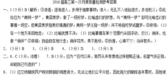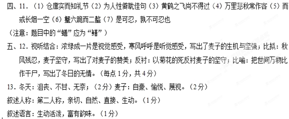 七、作文(70分) 19.根据以下材料,选取角度,自拟题目,写一篇不少于800字的文章:文体不限,诗歌除外。 ①“花和人都会遇到各种各样的不幸,但是生命的长河是无止境的。”(宗谱《紫藤萝瀑布》) ②“在快乐中我们要感谢生命,在痛苦中我们也要感谢生命。快乐固然兴奋,苦痛又何尝不美丽。”(冰心《谈生命》) ③“生命不光有风和日丽,也有苦雨和凄风。面对风雨,我们要坚信:黑暗过后是黎明,严冬过后是阳春。用你的激情点燃生命的一把火,去迎接生命的挑战。”(高建群《感谢创伤》) 参考答案 ![]() 鞭刑迫偿。(4分。每句1分) (2)崔公就选了一名大官,揭发了他的贪赃罪行,对其余轻微违法的小官立案查处,每到一处官员都很惶恐。(3分。每句1分) (3)然而对比他地位低的人,他能以说理来分辨,他没有不立即改变自己意见的。(3分。每句1分) 9.“心知其不然”是因为①元稹了解事情缘由;②了解崔公为人:“惑于众口”是因为③重口一词,自己的力量抵敌不过。(3分。每点1分) 三、10.(1)(2分)(我)听说白居易被贬为江州司马。(缺少对象或被贬均不给分) (2)(4分)①自己给病中的好友带来不安与震惊;②两人同病相怜,彼此知音;③两人处境相同,均遭贬;④对双方相见无期前途渺茫的悲愤。(每点各1分,答对4点给满分) (3)(4分)元诗末句融情于景,将对好友被贬的悲愤和病中凄苦的心情融于凄清景象的描写中,言有尽而情无限(2分);白诗末句直抒胸臆,直接抒发出被贬相隔不能相见的凄楚与无奈,感染力强。(2分) ![]() 14.内容上:插入了中国人和麦子结下的情缘,突出表现人与麦子之间的深厚情感;丰富了文章内容,增强了文章的抒情性。(2分) 结构上:启下,引出下文人们对于麦子的情结。(2分) 15.赞美麦子坚守不屈的品格;在没麦子给人以希望与幸福;赞美农民坚韧和对生活的信念与希望。(每点2分) 六、16.①老子认为技术之巧,出自人的机心,即伪饰,不能自然而然;②技术之巧是局部的、矫情的,是对自然状态的破坏,对生命和谐的破坏;③对巧的追求包含着对目的、理智、欲望的追求;④人企图用知识改变世界,很愚蠢,对文明的追求伴随着虚荣与奢华,不符合人的真性。(每点2分,3点即可) 17.①首先解释“大巧若拙”的内涵;(2分)②然后分析“大巧若拙”的美学意义、哲学思想及其源头;(2分)③最后阐释“大巧若拙”理念的现实意义(或人生意义)。(2分) 18.①要追求素朴纯全的美,讲求认知的神会;②提倡从天的角度认识智慧和事物;③反对欲望、享受和机心,提倡融于世界;④追求合乎本性的存在之道(人生境界)。(每点2分,答出任意三点即可)