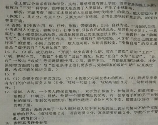 第Ⅱ卷 表达题 五、语言文字运用(20分) 13.依次填入下列各句横线处的成语,最恰当的一组是(3分)( ) ①马禝虽然才气过人,却 ,不宜独挡大局。可惜孔明心存偏爱,未能谨记刘备的忠告, 关键时刻派马禝驻防军事重镇,以至街亭失守。 ②严重违纪违法的原因,一是放松世界观改造,没有加强党性修养;二是 ,没有贯彻好民主集中制;三是道德品质低下,没有重视德行修养。 ③如果菲律宾停止干扰中国政府公务船依法执行公务,事态就会向好的方向发展;如果菲律宾 ,事态就可能升级,向更复杂化和长期化发展。 A.一意孤行 刚愎自用 独断专行 B. 刚愎自用 独断专行 一意孤行 C.独断专行 一意孤行 刚愎自用 D. 独断专行 刚愎自用 一意孤行 14.下列选项中,没有语病的一项是( )(3分) 在国务院常务办公会做出“扩大房地产税试点范围”的决定后,财政部、住房部和城乡建设部已经着手开展“房地产税试点范围”候选城市的筛选。 近年来,家庭生活剧呈“井喷”之势,这既是大家竞相模仿复制的结果,也是对涉案剧、宫 斗刷的限制政策,使得很多编剧把家庭生活作为首选造成的。 新进出台的进口、信贷以及PMI等前瞻性经济数据表明,在经历了两年的增速下滑后,中国经济正在走出下行区间,回升态势已经确立。 d.近年来,党和政府对农民工群体日益重视,不仅创造条件让他们更多参与党和国家的政治生 活,而且帮助他们解决就业、社会保障等方面的问题。 15. 填入下面一段文字横线处的语句,前后衔接最为恰当的一组是(3分) 文学是心灵的抚慰剂,许多人因为孤独而爱好文学,许多人因为穷困而爱好文学,也有一些人因为富足闲适而爱好文学—— ① 是出于什么原因, ② 他们信仰文学,崇尚真善美,文学 ③ 会让他们变得安贫乐道,富而不骄,让他们的内心充实、自信、淡定、颖慧。我总是天真地认为,真正爱好文学的人,属于天底下最善良的群落, ④ 坏, ⑤ 坏不到哪里去。验之现实,大致不错。以文学钻营的人, ⑥ 另当别论。 ① ② ③ ④ ⑤ ⑥ A 无论 如果 就 虽然 却 / B 不管 只要 就 即使 也 则 C 尽管 如果 都 虽然 却 / D 无论 只有 才 纵然 也 则 16. 在下面段文字横线处补写恰当的语句,使整段文字语意完整连贯 ,内容贴切, 逻辑严密,每处不超过15个字。(5分) 中华民族是一个讲究孝道传统的国家。子女尽孝,最重要的是,要看父母喜欢什么样的方式。其实,孝与不孝,(1) ,而在于老人是否“养则致其乐”。如果子女们因为精力有限,(2) ,让父母住养老院应是很好的孝敬父母的方式。(3) ,可以让老人们衣来伸手,饭来张口,颐养天年,特别是还有很多同龄的伙伴,有共同语言和志趣,可以一起聊天、读书、娱乐,这更有益于老人们的身心健康。 17.请观察下面以“深表同情”为题的漫画,描述其内容,并指出其寓意,不超过150个字。(6分) ![]() 寓意: 。 六、写作(60分) 18.以”谈‘己所不欲,勿施于人’”为题目,写一篇不少于800字的文章。(60分) 参考答案 ![]() 参考译文 孙玚,字德琏,是吴郡吴县人。(孙玚)年轻时就洒脱不拘束,喜欢研究战术攻略,广泛地涉猎经书史传,尤其熟悉书牍文札。王僧辩讨伐侯景时,王 琳(领兵)当前军,(因为)王琳与孙玚是同门师兄弟,于是(王琳)上表推荐(孙玚)当戎昭将军、宜都太守,随即跟从王僧辩到武昌救援徐文盛。适逢郢 (yǐng)州失陷,于是(孙玚的部队)就留在巴陵镇守,做好攻守的准备。不久,侯景的叛军杀到,不分昼夜地进攻巴陵外围阵地,孙玚督领部属全力抵御, (结果)叛军败退奔逃。高祖受禅为帝,王琳在郢州另外奉立梁朝的永嘉王萧庄为主,(并下诏书)征召孙玚为太府卿,加授通直散骑常侍。等到王琳向内地进犯 时,北周派大将史宁率领四万兵马,乘(防守)空虚(的机会)突然袭击(郢州城),孙玚部下协助防务的张世贵攻取外城以接应周兵,(郢州城因此)损失军民男 女三千余人。北周军队又堆起土山高架云梯,日夜攻击迫近,(又)乘着风势放火,烧掉了内城南部的五十多栋楼房。当时孙玚的军队不足一千人,都登上了城楼防 御把守,孙玚亲自巡视抚慰,向士卒敬酒劝食,士卒都乐于为他献身效力。北周军队竭尽全力也没能攻下(内城),于是假传北周君主的旨意任命孙玚为柱国、郢州 刺史,封为万户郡公。孙玚假装答应(他们)来作为缓兵之计,同时暗中加紧修整作战用的装备,敌楼、城墙和守城器械等,一天之中都严密设防,北周军队(对 他)非常害怕。到后来听说(陈朝)主力军已经打败了王琳,(即将)乘胜而进,北周军队才解围而去。于是孙玚控制了长江中流的全部地域,(他)召集将士并对 他们说:“我和王琳施展才力同尽臣责,一道辅助梁室,也可以算是很努力了。现在事情到了这样的地步,天意难道能够违抗吗!”于是派遣使者恭送表文到朝廷 (表示归顺)。高宗登上帝位之后,认为孙玚功绩名望一向显著,(对他)非常信任倚重。太建四年,任命(他)为都督荆、信二州诸军事,出京镇守公安。孙玚 (到任后),高筑城墙深挖城壕,恩威并用远近顺服,为周围境外的人所敬畏。后主继承帝位后,又任命(孙玚)担任通直散骑常侍,兼起部尚书之间的亲近之意。 (孙玚)又担任五兵尚书,领右军将军,仍然担任次侍中职务。后主多次驾临他家(看望慰问),还吟诗作赋赞颂(他的)功勋品德,展示君臣之间的亲近之意。 (孙玚)侍奉父母以孝顺闻名,对几位弟弟非常亲厚和睦。(孙玚)生性通脱平和,有财物就散发给亲友。(