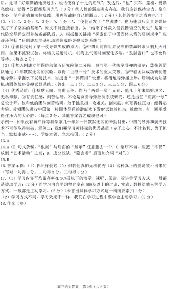 第Ⅱ卷 五、语言文字运用(20分) 13.下列各句中加点成语的使用,全都正确的一项是(3分) ①人大概要到了30岁以后,才会渐渐地收敛起往日招摇过市的锋芒,而在遇到不遂心之事的时候,做到安之若素吧! ②蒙娜丽莎的神秘微笑为什么是最美的?500多年来,一直以来,人们对此莫衷一是,即使是同一个观者,在不同的时间去看,感受似乎都有所不同。 ③季羡林先生风雨如磐的近百年人生,是一个世纪以来中国知识分子精神历程的真实写照。 ④你自己荐她来,又合伙劫她去,闹得沸反盈天的,大家看了成个什么样子? ⑤因监察机制缺失,权力无限膨胀,一些官员在自己的“一亩三分地”上讲排场,比阔气,一言九鼎,终因贪腐丢官。 ⑥宇宙茫无涯际,范围之大,难以想象,而这个星球仅是其中之一,它的存在可能仅仅对我们有意义。 A.①④⑥ 14.下列各句中,没有语病的一句是(3分) A.在咨政领域,我们不是等课题、要课题,而是主动捕捉最迫切的理论和实际问题,进行调研和原创性研究并向有关部门建言。 B.根据中国新闻出版研究院4月公布的数据显示,2015年我国0至8周岁有阅读行为的儿童家庭中,平时有陪孩子读书习惯的家庭占87.1%, C.由此可见,当时的设计者们不仅希望该过程中艺术活动是富有创造性的,而且技术活动也是富有创造性的。 D.不管是有意还是无心,“农民工逆袭”论调中隐含着农民工阶层和某些职业的歧视和偏见,实属不该。 15.填入下面文段空白处的词语,最恰当的一组是(3分) 四年一度的夏季奥运会正在进行,有关一些运动员“痛失金牌”的报道 ![]() 16.在下面一段文字横线处补写恰当的语句,使整段文字语意完整连贯,内容贴切,逻辑严密。每处不超过15个字。 真正的爱,是无条件的。你会教你的宠物不要随地排泄,它偶尔犯错,甚至学不会, 17.下面是美国学者埃德加·戴尔(Edgar Dale)1946年以语言学习为例提出的“学习金字塔”( Cone of Learning)示意图,请根据图表概括归纳“学习金字塔”的主要内容并谈谈该图给你的启示。要求语意简明,句子通顺。 ![]() 学习金字塔 (1)请概括归纳主要内容。(4分) (2)谈谈该图给你的启示。(2分) 六、作文(60分) 18.阅读下面的材料,根据要求写一篇不少于800字的文章。(60分) 2013年6月5日,习近平主席在墨西哥参议院发表演讲指出:庄子说过,水之积也不厚,则其负大翼也无力。我们要让中墨两国人民友情汇聚成浩瀚的大海,让中墨友好合作的大船不断乘风破浪前进。 2014年9月9日,习近平总书记在同北师大师生代表座谈时再次引用庄子的这句话:知识是根本基础。水之积也不厚,则其负大翼也无力。知识储备不足,视野不够,教、学必然捉襟见肘,更谈不上游刃有余。 读了上述材料,你有何看法和感想?请综合材料内容作文,体现你的思考、判断。要求:选好角度,确定立意,明确文体,自拟标题;不要脱离材料内容及含意的范围作文,不要套作,不得抄袭。 参考答案 ![]() ![]()