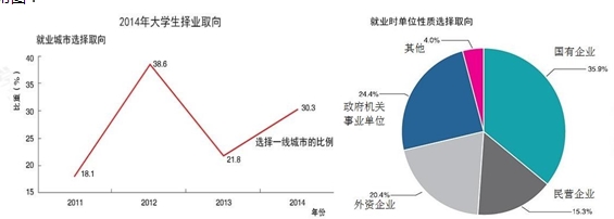 四、实用类文本阅读(25分) 12.阅读下列材料,完成(1)~(4)题。(25分) 材料一 麦可思研究院调查编著的《2014中国大学生就业报告》9日正式发布。作为一个第三方机构,此次麦可思研究院的调查共回收样本约26.8万份,覆盖全国28个省市区及814个专业、665个职业、326个行业,这是其第六年发布就业蓝皮书。 据调查结果,本科院校2013届大学毕业生毕业半年后就业率为91.8%,与2012届(91.5%)基本持平,比2011届(90.8%)上升1个百分点。其中,建筑学以98.3%的毕业半年后就业率高居所有主要本科专业榜首,而应用物理学毕业半年后就业率垫底,为88%。 2013届本科和高职高专毕业生的工作与专业相关度分别为69%、62%,均与2012届(分别为69%、62%)持平,均略高于2011届(分别为67%、60%)。从近三届的趋势可以看出,大学毕业生的工作与专业相关度呈现平稳趋势。 麦可思研究院副院长周凌波认为,大学毕业生自愿选择与专业不相关的工作,主要是对专业相关工作不认同。2013 届本科毕业生选择与专业无关工作的最主要原因是“专业工作不符合自己的职业期待”(33%),其次为“迫于现实先就业再择业”(25%)。 调查还显示,“民营企业/个体”是2013届大学毕业生就业最多的用人单位类型,本科院校中有45%的毕业生就业于“民营企业/个体”,高职高专院校毕业生则有63%。2013届大学毕业生就业比例最高的用人单位规模是300人及以下规模的中小型用人单位(51%),其中本科毕业生这一比例为45%,高职高专毕业生为56%。中小民营企业是大学生就业的主要雇佣者,鼓励中小民营企业招聘应届大学毕业生,是提升就业的主要渠道。 此外,2013届大学毕业生自主创业比例为2.3%,比2012届(2.0%)高0.3个百分点,比2011届(1.6%)高0.7个百分点。2013届高职高专毕业生自主创业比例(3.3%)高于本科毕业生(1.2%)。(《光明日报》2014年06月10日) 材料二 2013年“史上最难毕业季”已经远去,2014年“更难就业季”如期而至。近日,中华英才网发布了第十二届《中国大学生最佳雇主调查报告》,该报告自2014年2月份开始样本和数据的采集,历时3个月共收集有效样本近5万份,对中国大学生择业进行科学合理的分析。 截至2014年5月底,38.9%的受访大学生仍未有明确的就业单位。其中,从地区上看,生源地为上海、北京的大学生签约率基本在85%以上,高出全国平均水平约24-29个百分点;而东北、华中的学生签约率全国最低,华中地区比平均水平低了约16个百分点。从专业上看,哲学、管理学、历史学专业的大学生 签约率较高,理学和农学专业总体较低。 报告显示,有30.4%已签约的在校大学生选择一线城市的单位就业,没签约的大学生也有30%打算在一线城市就业,而对参与调查的所有大学生来说,这个数字是30.3%,比2013年的21.8%有较大比例提高。 从行业看,大学生择业的首选是文化、体育和娱乐业,其次是金融业,第三是信息传播、计算机服务和软件业。 从单位性质看,35.9%的在校大学生把国有企业作为就业的首选。 不过,在工作三年以上的就业人群中,仍选择国企的比例下降为 23.91%,而愿意选择民营企业的比例则达到了 33.63%。该报告分析称,尽管国有企业在福利保障体系和职位稳定性方面依然具有优势,但随着社会福利保障体系的完善和大量新兴市场机会的出现,国企的吸引力已经开始下降。 值得注意的是,在已毕业大学生中,有自主创业倾向的人占到了18.9%,接近两成,较2013年的2.21%有了大幅度的增长。 (《南方周末》2015年3月20日) 附图: ![]() 材料三 由于连年扩招,从2003年至2014年,12年间全国普通高校毕业生累计接近1亿人,总数翻了一番还要多,因而高学历劳动力供给十分充足。从“刘易斯拐点”(“刘易斯拐点”代表了一个国家的劳动力从剩余向短缺变化的转折点)的角度看,高学历劳动力还处于“刘易斯拐点”之前的工资平稳期,他们与老板议价的空间并不大,体面就业更难。 中国经济正面临转型,一方面,在大力调整夕阳产业和淘汰落后产能时,传统的就业岗位将大量消失。另一方面,由于科技进步、有机构成变化、劳动生产率提高等因素,传统工作岗位将大量摧毁。 再就是大学生的就业观念问题以及选人用人配套措施不完善使得人才不能合理流动。每年上百万的公务员考试大军、国企招聘火爆、民企乏人问津、一线城市扎堆儿求职、西部城市人才缺乏等现象,既反映出大学生的就业观念亟须更新,也说明我们的选人用人配套措施尚不完善,人才不能在不同行业、不同地区间合理流动,造成大学毕业生体面就业机制不畅通。(摘自《中国青年报》2014年09月09日) 材料四 分析高校毕业生就业难的原因,既有老因素,也有新原因。老因素包括,高校专业设置出现偏差,培养模式与实际对接不上;高校毕业生高不成低不就,不肯放下身段到民企等企业就业;以制造业为主的经济结构迟迟转变不过来,不利大学生就业等。新原因主要是今年经济形势异常困难,原来很多需要用人的部门和企业为节省人工成本等,大幅降低了招聘比例;此外新增毕业生比往年多,今年全国高校总的毕业生达到近700万,比上年高出12万。 大学生就业难是一个世界性现象。我们出现的一个独特情况是,一边是大学生找工作难,一边是农民 工用工荒,很多企业招不到农民工。这里反映的问题就是,中国的经济结构对大学生就业有一种抑制作用。所以,要从根本上解决大学生的就业难题,必须改革中国的经济结构
