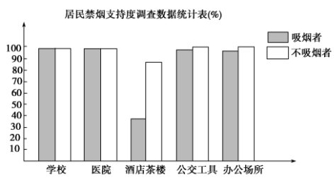 第二卷 三、语言文字运用(20分) 17、依次填入下列各句横线处的成语,最恰当的一组是( ①烈日炎炎,持续的高温让市民________,省内各市纷纷“让洞于民”,免费向社会开放一批可用于避暑纳凉的人防工程。 ②我县坚持文化“普惠”理念,先后投资5亿多元,建成了8个文化中心,安装健身器材2600多台,文体设施________。 ③“菊花节”期间,公园里摆放着各种盆栽菊花,姹紫嫣红,微风一吹,轻轻摇曳,仪态万千,赏花的市民流连其间,________。 A.不堪忍受 C.情何以堪 18、下列句子,没有语病的一句是( A.用制度保障生态文明建设,是一项在“保护优先”价值取向下制定游戏规则的创新性工作,是对现有制度安排的发展、改革与继承。 B.精准扶贫,是为了脱贫。要完善贫困对象,建立电子档案,按照“脱贫即出,返贫纳入”原则实行动态管理。 C.中国互联网协会6日发布《2015中国互联网产业综述与2016发展趋势报告》指出,截止2015年11月,我国手机上网用户数已超过9.05亿,再创新高,月户均移动互联网接入流量突破366.5兆。 D.2016年1月1日起,我国将燃煤发电上网电价全国平均每千瓦时降低3分钱,打出去产能、降成本、减轻企业负担、促进结构性优化的“实招”。 19、填入下面一段文字横线处的语句,最恰当的一句是( 发展家庭农场, A.只有达到一定规模才能产生效益,适度规模经营是“底线”,因为实践证明,家庭农场的规模并非越大越好 B.适度规模经营是“底线”,只有达到一定规模才能产生效益,但实践也证明,家庭农场的规模并非越大越好 C.适度规模经营是“底线”,家庭农场的规模并非越大越好,但实践也证明,只有达到一定规模才能产生效益 D.只有达到一定规模才能产生效益,家庭农场的规模并非越大越好,因为实践证明,适度规模经营是“底线” 20、在下面一段文字横线处补写恰当的语句,使整段文字语意完整连贯,内容贴切,逻辑严密。每处不超过15个字。(5分) 中国文人的狂言狂事,数也数不清。但细分文人之狂, 21、 (1)概括图表反映出的信息。(不超过30字)(4分) (2)请你任选图表中的一个场所拟写一条禁烟提示语。(不超过20字)(2分) 四、写作(60分) 22、阅读下面的材料,根据要求写一篇不少于800字的文章。 台湾爱乐乐团到大陆某市演出,场地两侧不断打出“演出中请勿摄影录音”字幕。演出中,不少观众被精彩表演所感染而猛拍猛录。在场地维持秩序的工作人员,发现谁违规,就用镭射光笔直接照谁,被照观众有的自觉理亏,有的恼羞成怒,现场秩序时好时坏。演出后,爱乐乐团官方微博发出帖子,表明不欢迎那些不尊重艺术的观众。 对以上这件事,你是怎么看?请你以网友的身份,对爱乐乐团、观众或工作人员的表现加以评论,表明自己的态度,阐述自己的看法。 要求综合材料内容及含意,选好角度,确定立意,完成写作任务。不得泄露个人信息。