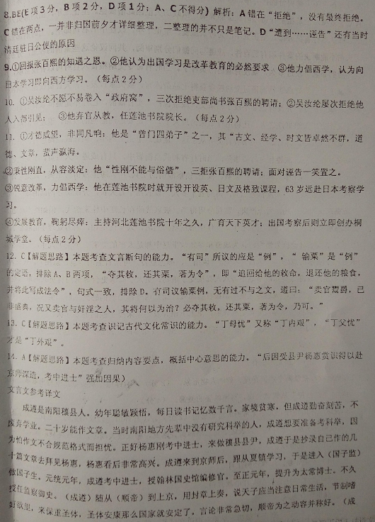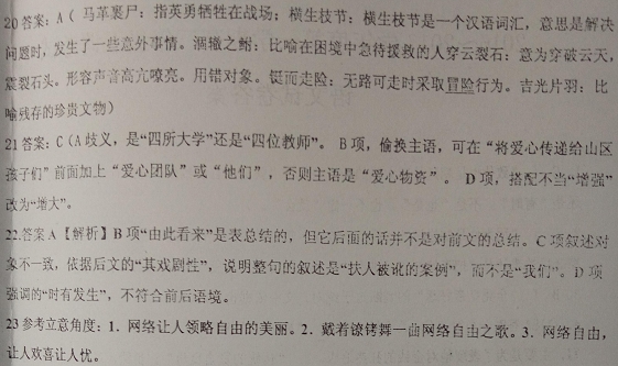 第Ⅱ卷(表达题共65分) 五、语言文字运用(5分) 20.下列各句中加点词语的使用,全都正确的一项是 ①中国海军在南海举行的军演,展示出新时期中国军人保家卫国的勇气和决心,即使马革裹尸,也要捍卫主权。 ②中国和本地区国家就解决南海分歧达成了有效共识,希望域外国家支持而不是干扰中国和东盟国家的努力,不要横生枝节,不要试图破坏这个局面。 ③但人不能饿着静候理想世界的到来,至少也得留一点残喘,正如涸辙之鲋,急谋升斗之水一样。 ④莫言小说最先征服你的并不是故事和人物,而是语言。那一个个平淡的文字背后深藏着穿云裂石的哀痛和精彩斑斓的怜爱。 ⑤日前,一名小伙为了让自己的网络直播更火,铤而走险去直播捅马蜂窝,结果被马蜂蜇成重伤,住进了重症监护室。 ⑥仿佛昨天才踏进校门,谁料倏忽之间,高中三年已经过去,吉光片羽,无处寻觅,令人唏嘘不已。 A.①②③ 21.下列各句中,没有语病的一句是 A.为了丰富课余文化生活,武昌南湖中学邀请了四个大学的热衷于饮茶文化的教师利用选修课时间为同学们传授茶之历史、品茶礼仪等方面知识。 B.佳沛爱心团队提倡以分享之心做公益,通过各种活动筹得的爱心物资,随着团队进人大山,将爱心传递给山区的孩子们。 C.人们很快会忘记网上对猴年生肖吉祥物的恶搞,因为互联网时代,流行图像的价值往往取决于它是否“新奇”和“刺激”。 D.在网络公共言论平台日趋多样、日益扩展的情况下,公民举报官员的途径也大大增加,同时也增强了公民实现其权利的可能性。 22.填入下面一段文字横线处的语句,最恰当的一句是 仅凭“老人”“摔倒”“女大学生”“寻找证人”等字眼,就拼接符合想象的“真相”,得出“扶 A.现实生活中,确有扶人被讹的案例,但相对而言仅是个例 B.由此看来,扶人被讹的案例在现实生活中虽然仅是个例 C.我们也常看到扶人被讹的个别案例在现实生活中发生 D.现实生活中,扶人被讹的案例虽然不是个例 六、作文(60分) 23.阅读下面的材料,根据要求写一篇不少于800字的文章。(60分) 北京卫视《我是演说家》第三季的一期节目中,公关男陈抒泽就当年加州被枪杀中国留学生被网络暴民贴上各种“富二代…活该…宝马男”的标签事件进行正名,认为网络“键盘侠”很多都是抱着不负责任的态度无理取闹,恶意揣测,甚至肆意诽谤。 有人认为,自由必须要限定在一定的规矩之中才能体现其益处,我们应注意自己在网络上的言论影响,限制网民不加思考和调查的自由表达,禁止诽谤和传播谣言;有人认为网络言论自由是时代发展、民主进步的集中体现,不应外力干预;也有人认为…. 那么关于网络言论自由,你有怎样的看法和评价? 要求:请结合材料内容及含意作文,选好角度,确定立意,明确文体,自拟标题,不要套作,不得抄袭。 参考答案 ![]() ![]() ![]() ![]()
