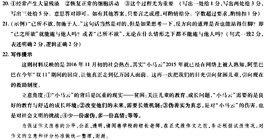 2017届高三年级第七次月考语文试卷参考答案 1. B。 “汉学是中外学者……”中“中外学者”有误。 2. C。原文无此信息,属于无中生有。 3. D。A项,“国人希望通过汉学来了解中国及其文化”不正确。B项,“希望汉学能成为显学”不符合原文意思。C项,“国学已经变成了‘在中国的汉学’,汉学也变成了‘在中国的国学’”与文意不符。 4.A(以偏概全。乌镇互联网会议是以“进一步加强和加深互联网领域国际的合作,引领全球互联网共谋发展大业”为目标,“互联网安全”只是会议的一个重要话题) 5.①商业泄密;②用户信息泄露风险;③侵犯个人隐私、侵犯知识产权等网络犯罪时有发生;④网 络监听、网络攻击、网络恐怖主义活动成为公害。(每点1分) 6.①采用“量子通讯”,解决泄密问题。(1分)②不断完善机制、搭建平台,努力推动国际法院信息化交流。(2分)③深化技术研发、规则制定、信息共享、人才培养等方面的国际交流合作。(2分) 7.答案:AD(A 项“对唐诗有极大的兴趣”有误;D项“用说教的方式”欠妥)(答对一项给2分,答对两项给5分) 8 ①勤俭持家,任劳任怨。她勤劳节俭,一刻不停地忙碌着,毫无怨言。 ②体贴晚辈,善良无私。她体贴儿子媳妇,疼爱孙子,把平日积攒的零钱拿出来补贴儿子一家。 (答出一点且分析正确给2分,意思对即可。如有其他答案,只要言之成理,可酌情给分) 9 ①以《游子吟》为线索来叙述故事,串联情节。 ②借《游子吟》内涵的时代变迁来刻画人物,揭示主题。 (答出第一点给2分,答出第二点给3分,意思答对即可。如有其他答案,只要言之成理,可酌情给分) 10. D(原文标点:五路出师讨西夏,雍为都会,事倚以办,调发期会甚急,光庭每执不从。使者怒,将加以乏兴罪,光庭求免去,大防为之解。) 11. C(关于左、右尊卑和左、右官位的高低的表述绝对化,不同时期,左、右尊卑和官位高低有变化) 12. B(“批评蔡确不守臣礼,使蔡被贬新州”错,蔡确被贬新州不是因为朱光庭批评他不守臣礼,而是因为朱光庭弹劾他怨恨非议的罪行) 13.(1)详细地阅读了苏轼的文章的意思,这是针对现在的有关 官员而说的,不是用来讽刺祖宗的。(得分点:是、有司、所以,各1分,句意2分) (2)流亡的百姓进入潞州境内的连续不断,朱光庭每天准备食物给他们吃,常常忙到夜里,自己来不及吃饭。 (得分点:踵接、第二个“食”、不暇,各1分,句意2分) 参考译文: 朱光庭,字公搂,十岁能写文章。推辞父亲的恩荫,考中进士,调任万年县主簿。几次代理县令,人们称他是“明镜”。历任四个县的县令。曾孝宽因为朱光庭有才能而向朝廷推荐,神宗召见朱光庭,问到想再次出兵攻打安南。朱光庭回答说:“希望陛下不要把安南当作人类来养。因为得到他们的土地不能居住,得到他们的百姓不能使用,对开拓疆土有什么好处?”皇帝又问朱光庭研究什么经书,朱光庭回答说:“年少时跟从孙复学习《春秋》。”皇帝又问:“现在在朝廷内外听到些什么吗?”回答说:“陛下更改法度,臣下奉行命令有的不是圣上的旨意,所以有的好有的不好。如果能去掉那些不好的,那天下就会得到福分了。”跟随吕大防在长安幕府。朝廷五路出兵讨伐西夏,雍州是大都市,许多事情都靠这里去办,调发人员物资期限很紧,朱光庭常常坚持不答应。使者生气,将要施加军需物资缺乏之罪,朱光庭请求罢职离去,吕大防替他调解。 哲宗继承皇位,司马光推荐朱光庭做左正言,朱光庭首先请求罢免提举常平官、废除保甲青苗等法律。认为蔡确身为山陵使,却走在先帝的灵柩之前,作为臣子不恭敬。又说章悖欺骗蒙蔽肆意狡辩,韩缜奸邪求宠,话很耿直。宣仁太后赞扬他能守正道,告诉他畅所欲言,不要有什么畏惧、回避。 升任左司谏,议论说“苏轼拟馆职考试题说:‘现在要效法仁宗的忠厚,而担心有关官员不能尽职,可能会玩忽职守。’我认为仁宗有难以形容的盛德,而不应当用‘玩忽’来议论,希望惩办他的罪行,来警戒大臣中不忠诚的人。”不久,中丞傅尧俞、侍御史王岩叟相继论述这件事。宣仁太后说:“详细地阅读了苏轼的文章的意思,这是针对现在的有关官员而说的,不是用来讽刺祖宗的。”于是议论停止。 河北闹饥荒,朝廷派朱光庭拿着符节巡行视察,立即打开粮仓救济百姓;而议论的人认为他消耗先帝多年积累的军需物资,改任左司员外郎。升任太常少卿,授任侍御史。弹劾蔡确怨恨非议的罪行,蔡确被贬到新州。授任右谏议大夫、给事中。 调任潞州。邻近州县境内发生旱灾闹饥荒,流亡的百姓进入潞州境内的连续不断,朱光庭每天准备食物给他们吃,常常忙到夜里,自己来不及吃饭,于是生病,还勉力办公事。去世,享年五十八。 朱光庭起初跟从胡瑗学习,胡瑗告诉他治学的根本在于忠诚守信,所以朱光庭终身践行。 14.A(2分)D(3分) 15.描写了这样的图景:天已入暮,江上的儿童还在辛勤地划船(2分),天晚了,山中的妇女还在捶洗衣裳(2分),表达了诗人对劳动人民辛苦劳作的深厚同情(2分)。 16.(1)忳郁邑余侘傺兮,吾独穷困乎此时也 (2)枯松倒挂倚绝壁 (3)海日生残夜,江春入旧年。 17. A(①山清水秀:形容山水风景优美。②孤芳白赏:白命清高,自我欣赏。③因噎废食:因为吃饭噎住过,索性连饭也不吃了,比喻因怕出问题,索性不干。不合句意。④花拳绣腿:姿态好看而搏斗时用处不大的拳术,比喻外面好看而没有实用价 值的做法。⑤风姿
