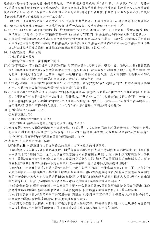 四、写作(60分) 22.阅读下面的材料,根据要求写一篇不少于800字的文章。(60分) 粉色封面、便携皮套、小开本、轻型纸,还有好妹妹乐队演唱的主题曲、阅读陪伴APP,以及“可以一起拍照”——近日,某微信公众号推出青春版《红楼梦》,并宣称:这是“《红楼梦》225年出版史上的最优质版本”。 岂料,“最优质版本”在出版圈和读者中引起轩然大波,豆瓣网友甚至对该书发出“一星”集体差评。当明星们拿着粉红色封面的青春版<红楼梦》拍照时,有人感叹,这果然不是一套属于读者的《红楼梦》,而是一部属于观众的《红楼梦》,所谓青春版《红楼梦》不是文化出版的书,看起来更像是娱乐业的产物。 要求:结合材料内容和含意,选好角度,确定立意,明确文体,自拟标题;不要套作,不得抄袭。 参考答案 ![]()