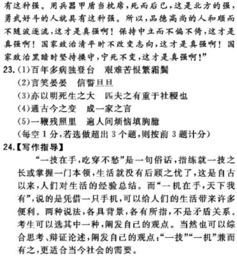 四、作文(60分) 24.阅读下面文字,根据要求作文。(60分) 当今社会到底是“一技”重要还是“一机”重要?某校班会课围绕“一技”和“一机”展开了讨论。有人提出:“一技在手,吃穿不愁”,所以要沉下心来,练就一技之长或掌握一门本领;也有人提出“一机在手,天下我有”,只要会操作一只手机,在如今这个信息社会中,就可以玩转自己的世界了。 对此,你的观点是什么?请写一篇论述类文章加以阐明。 【注意】①题目自拟。②不得少于800字。③不得抄袭、套作。 ![]() ![]() ![]()