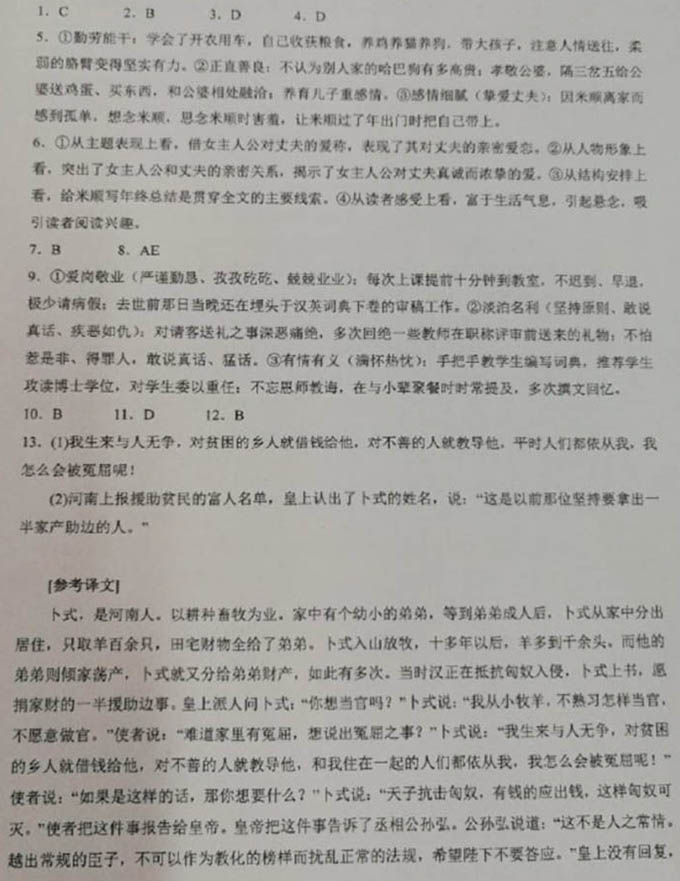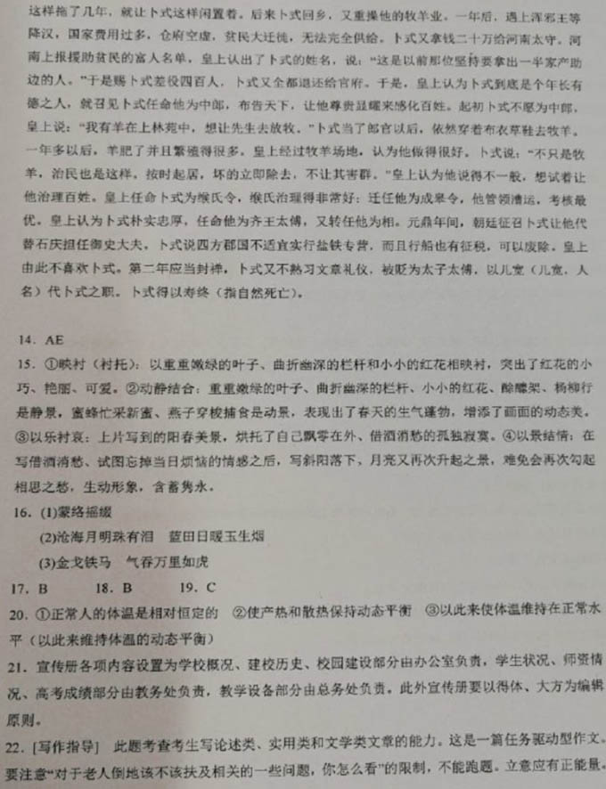 第II卷 表达题 三、语言文字应用(20分) 17.下列各句中加点成语的使用,全都正确的一项是(3分)() ①他悬腕挥毫,笔走龙蛇,时如惊雷滚滚,疾风阵阵;时如长云飘飘,大石盘盘;错落如群鸟呢喃,参差若杨柳扶风。 ②攀到小山顶上,环视四周,山高水低,无限风光尽收眼底,我扶着栏杆,眯着眼睛,痛痛快快地享受那拂面的清风。 ③各级党组织要帮助和督促党员在遵守清规戒律方面开好头、把持住、养成习惯,为建设良好的政务环境而不懈努力。 ④天台山的红叶分布较广,主要集中在黄桨岩、银顶峰、花石海、十八里香草沟,而小九寨的红叶景观更是秀色可餐。 ⑤客户端评论说,“让咱的大米走向世界”“大米,我们的骄傲”,支持之热情和由此燃起的骄傲之情可见一斑。 ⑥他高度评价了志愿军的历史地位和丰功伟绩,深刻指明了抗美援朝战争的历史内涵和深远意义,怎能不大快人心呢? A.①②④ B.①④⑤ C.②③⑥ D.③⑤⑥ 18.下列各句中,没有语病的一句是(3分)() A.为方便个人异地生产生活的需要,本银行行内异地存取现款、转账等业务,将于本通知发布之日起三个月内实现免费。 B.“老舍的《四世同堂》在美遗失的原稿找到了!”昨天,这条足以令国内文坛和现代文学研究界兴奋的重磅消息迅速流传开来。 C.目前,南昌西汉海昏侯墓的竹简清理和首轮红外扫描的工作已经完成,有专家通过竹简上文字的分析,发现了疑似棋谱的古籍。 D.静静陈列在厂房里的火箭箭体,悄然诉说着中国航天事业所走过的坎坷之路以及所做出的辉煌成就,让每一位在场者都感到了震撼和惊叹。 19.填入下面文段空白处入的词语,最恰当的一组是(3分)() 羊伴随人类的时间久远,与人类关系密切;① 形体适中,攻击力差,② 对人③毫无威胁;又因其食草,而产出的 ④ 是奶、肉、毛、皮;⑤ 性格温顺,易于驯服,故而成为人类最早饲养的动物。在古人心目中的重要位置,⑥ 被赋予了种种文化含意和象征。 ![]() 20.在下面这段文字横线处补写恰当的语句,使整段文字语意完整连贯,内容贴切,逻辑严密,每处不超过15个字。(5分) ① 。人体通过大脑与丘脑下部的体温调节中枢的调节和神经体液的作用,② 。正常生理状态下,体温升高时,机体通过减少产热和増加散热来维持体温相对恒定:反之,当体温下降时,则产热增加而散热减少,③ 。 21.下面是某校编辑宣传册的初步构思框架,请把这个构思写成一段话,要求内容完整,表述准确, 语言连贯,不超过85个字。(6分) ![]() 四、写作(60分) 22.阅读下面的两则材料,根据要求写一篇不少于800字的文章。(60分) ①前不久,78岁的南京老人顾馥珍乘坐公交车时不惧摔伤,倒地个起。紧急时刻,来南足京找工作的22岁小伙子李壮梃身而出,在建议其他乘客下车后,他和司机一起将顾馥珍送到医院,陪老人做各项检査,并通知其亲域。老人亲属赶到医院后对小伙子感激不尽并想表达心意,但李壮婉言谢绝:“这些都是我应该做的小事。” ②2011年8月27日,某汽车集团司机殷红彬在驾驶途中,看到一位老奶奶摔倒在立交桥上,他下车将老人扶起,交由路过村民送医。老人随后指认殷红彬是肇事者。车内有监控录像记录了救人过程,车上乘客也证实殷红彬确为救人。事件经电视台披露引起广泛关注,老人及其子后来改口,承认殷红彬是救人者。 对于老人倒地该不该扶及相关的一些问题,你怎么看?请综合材料内容及含意,选好角度, 定立意,明确文体,自拟标题,不要套作,不得抄袭。 参考答案 ![]() ![]() 本题有以下几个立意 (1)扶起老人,是在扶起自己和社会的良心。 (2)既要扶起倒地的老人,又要学会保护自己。 (3)避免见义勇为者流泪,要让讹诈者付出代价。 (4)扶起倒地的老人,更要完善相关法律。