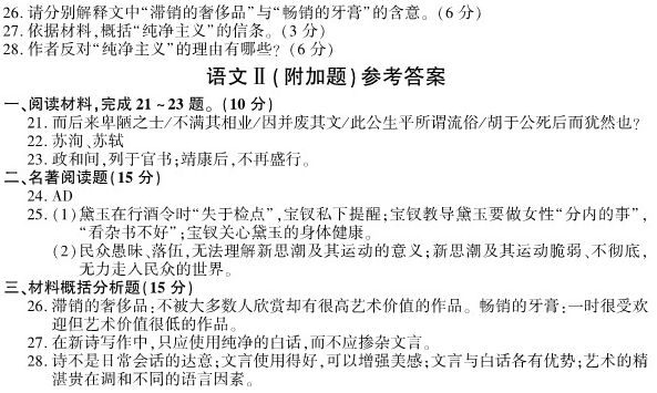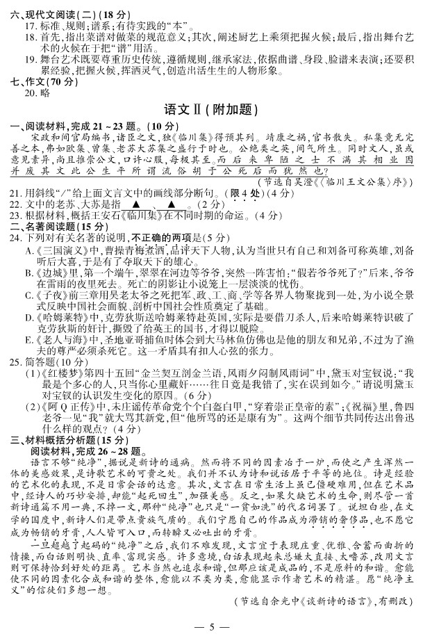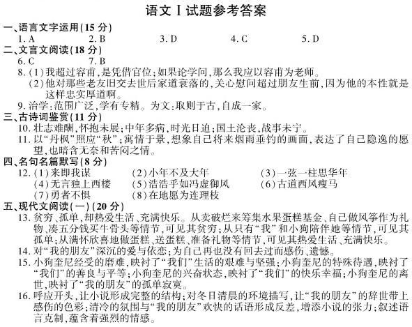 五、现代文阅读(一)(20分) 阅读下面的作品,完成13 ~16题。 一个圣诞节的回忆 [美]杜鲁门·卡波特 请设想一下二十多年前一个十一月的早晨,一个白发剪得短短的妇人站在窗口,大声说:“这是做水果蛋糕的好天气!巴迪,去把我们的车推来,我们要烤三十个水果蛋糕呢。” 那时我七岁,她六十光景,我们是很远的表亲。从我记事起,我俩就住在一起。她叫我“巴迪”,为了纪念她以前最好的朋友。那个巴迪早死了,当时她自己还是个孩子。她现在仍是个孩子。 我们把童车推进山核桃树丛。童车是我出生时买的,快散了,轮子摇来摆去,像醉鬼的腿。奎尼是我们养的一条小狗,她挺过了一场瘟疫和两次响尾蛇的噬咬,现在一路小跑跟在小车旁。 三个小时后我们回到厨房,把拉回家的满满一车风吹自落的山核桃的壳剥去。欢快的裂壳声像是微弱的雷鸣,核桃肉散发着甜美的香气。奎尼求我们给她点尝尝,我的朋友时不时偷偷给她一点,但我俩是绝对不可以吃的,“这些山核桃还不见得够做三十个水果蛋糕呢。”明月高照,小车空了,碗满满的。 第二天,我最喜欢的事开始了:大采购。樱桃,柑橘,香草,葡萄干,威士忌,大量的面粉和黄油……嗬,简直要一匹小马才能把车拉回家。我们没钱,但每年总能用尽各种办法,筹到一笔水果蛋糕基金:卖破烂,卖摘来的一桶桶黑莓、一罐罐自制的果酱、苹果冻,为葬礼和婚礼采集鲜花。 黑驴子加足了煤和柴火,烧得像一直发光的南瓜。打蛋器旋转着,调羹在一碗碗黄油和糖里搅动,香蕉让空气变得甜甜的,姜又增加了香味。厨房里浓香扑鼻,弥漫到整幢屋子。四天后,大功告成,三十只蛋糕放在窗台、搁板上晾着。 蛋糕给谁呢?朋友呗。不一定是邻近的,大半倒是只见过一次,甚至素未谋面的,我们喜欢的朋友。例如罗斯福总统,一年来镇上两次的小个子磨刀人,帕克(班车司机,他每天在尘土飞扬中嗖地一声驶过时和我们互相挥手招呼)。是不是因为我的朋友太害羞了,才把这些陌生人当作真正的朋友?我想是的。我们的纪念册里有用白宫信笺写的的答谢信,有磨刀人寄来的一份钱明信片——它们让我们觉得和外面的丰富的世界联系在一起。 厨房空了,蛋糕都送走了,我的朋友要庆祝一下——还剩下一点威士忌。奎尼分到满满一勺,倒在她的咖啡碗里(她喜欢菊苣香的浓咖啡),我们平分剩下的。奎尼躺在地上打滚,爪子在空中乱抓。我身子里热烘烘地冒火星,像快要烧成灰烬的木柴。我的朋友围着路子跳圆舞曲,两只手提起那身蹩脚的花布连衣裙的裙边,就像是舞会上穿的礼服,唱着“指给我回家的路”。 下一个任务就是准备礼物。我想给她买整整一磅樱桃巧克力,不过,我给她做了只风筝。她希望给我一辆自行车,不过,我肯定她也是给我做风筝——和去年一样,和前年也一样。我们又凑了五分钱给奎尼买了一大根还有余肉可啃的牛骨头,用彩纸包起来,高高地挂在圣诞树顶上一颗银星边。奎尼知道那是牛肉骨头,馋得坐在树下呆望着,该睡了还不肯走。我的兴奋不亚于她,踢被子,翻枕头,就像是热得不可开交的夏天夜晚。我的朋友手持蜡烛坐到我的床沿:“我一点也睡不着,心像兔子一样乱跳。你说罗斯福夫人会在晚餐时端上我们的水果蛋糕吗?”我俩在床上挤作一团,她在我的手心里写“我爱你”。“你的手比以前大了。我想我大概不愿你长大。你长大了,我们还能继续当朋友吗?”我说我们永远是朋友。 这是我们一起过的最后一个圣诞节。 我上了军事学校。我也有了新家,但那不算数。我的朋友在哪里,哪里才是我的家,而我再也没回去过。 她还待在那里,有奎尼做伴,后来只剩她一个人。(她写道:“昨天,梅西的马踢伤了奎尼,伤得很重。谢天谢地,她没有太痛苦。我把她包在一张条纹床单里,用童车推到草地……”)以后几年的十一月里,她还是做水果蛋糕,她一个人,没有从前做得多,不用说,总是把“最好的那个”寄给我。渐渐地,她在信中把我和早已死去的巴迪混淆起来。 终于,又一个十一月的早晨来临,一个树叶光光、没有小鸟的冬天早晨,她再也爬不起来大声说:“这是做水果蛋糕的好天气!” (有删改) 13. 结合情节,简要分析小说中“我的朋友”的生活状态。(6分) 14. 文中画线句表达了“我”什么样的情感?(4分) 15. 小狗奎尼在小说中多次出现,简析其对人物刻画的映衬作用。(4分) 16. 请探究小说结尾的表达效果。(6分) 六、现代文阅读(二)(18分) 阅读下面的作品,完成17~19题。 从脸谱说起 叶秀山 脸谱在京剧艺术中不可或缺,实在是我国艺术家对世界艺术作出的特殊贡献。不过,以前也常听批评家在贬义上使用这个词,说人物没有个性,有公式化、概念化的毛病,则斥之曰“脸谱化”。 其实,脸谱与概念、公式是完全不同的。概念、公式是抽象的,但脸谱却不能归结尾抽象。我想,批评脸谱公式化、概念化的,其中有一点未曾深察的是在那个“谱”字上。 “谱”有标准、准则的意思。我们常说某人说话、行事“没谱”,是言其做事说话不遵守一定的规则、无法沟通、交流,也无法理解。“谱”是要大家都能遵守的,没有规矩,不成方圆。“谱”还有谱系的意思。谱系是历史性的,是一种传统。历史不同,传统不同,谱系也就不同,于是有各种不同的家法、流派。京剧的脸谱,也有不同的家法,同样是曹操的脸,勾画上也是大同中有小异。此外,凡称“谱”的,都是有待