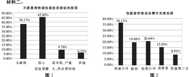 B.根据材料二图1可知,大家不愿意将快递包装送回收站的原因主要集中在两点:一是害 怕自己的信息遭到泄漏,二是认为将其送回收站太麻烦。