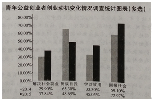 (三)实用类文本阅读(本题共3小题,12分) 阅读下面的文字,完成7~9题。 材料一: 公益创业又称社会创业,是近年来在全球范围内迅速兴起的一种全新创业理念与创业模式。在开展追求社会价值和商业价值并重的创业活动时,公益创业兼顾社会性和企业性,将实现社会价值和企业化运营结合在一起,在儿童保育、残障人士就业、社区发展等领域积极开展社会创新。公益创业不仅涵盖了非营利性机构的创业活动和营利性机构践行社会责任的活动,还成为政府失灵和市场失灵的矫正力量。 它以和平方式达到了以往通过暴力和流血也未能实现的社会目标。公益创业的兴起是创业领域最重要成果之一,赢得了社会的广泛关注和好评。在解决社会问题,打破国家“福利僵局”方面起到了积极作用,并将对21世纪人类社会的发展产生更为深远的影响。公益创业的开启是创业教育的重要里程碑,也是未来创业研究的重要领域。 公益创业同样面临可持续发展的问题。只有专业化、具有公信力的工作才能获得资助人的认可,进而获得持续的资金来源。最重要的是做到财务透明,让资助人知道钱是怎么花出去的。 公益创业要取得成功,关键在于公益创业者和社会环境两个方面。公益创业是公益创业者和环境之间持续互动的过程。社会环境极大地影响公益创业者的积极性、公益创业的领域、公益创业所能采取的组织形式以及公益创业的成功率。 (选自《解读<中国青年公益创业调查报告2016>》) 材料二: ![]() (选自《中国青年公益创业调查报告》) 材料三: 越来越多的高校通过开展公益创业教育,以创造社会价值作为自我实现的途径,培养学生公益创业意识,促进青年大学生参与公益创业活动,用实际行动来解决社会问题。 (节选自《青年人是公益创业主体力量,他们为何选择这条“少有人走的路”》) 材料四: 国内公益创业的商业运作状况又是怎样的呢?关于“收入来源于商业活动的此例”的问题,《中国青年公益创业调查报告》数据显示,商业活动的收入占总收入50%以上的公益创业组织占42%;商业活动的收入占总收入50%以下的公益创业组织占44%。有将近一半的公益创业组织商业活动收入超过总收入的50%,公益创业组织以市场化运作手段获取一定的利润,采用企业化的经营方式,其收入来源具有明确的商业性。 “行业间的界限变得越来越小,商业和公益也出现了更多更新的合作模式。只有更加擅长整合跨界的资源,公益机构才能探寻到更加可持续的模式,撬动更多的利益相关方来进一步推动社会福利事业的发展。商业化运作与盈利可以使公益创业者摆脱对捐款的依赖,减轻政府推动社会福利事业发展的重负。”这是北回归线爱心协会发起者王方圆的回答。 公益创业具有市场导向性。“市场导向性”表明公益创业的绩效驱动、竞争性和前瞻性。虽然公益创业和商业创业最大的区别在于是经济效益优先还是社会效益优先,但是公益创业为了获得可持续的发展,必须以商业企业的方式运作并获取利润。公益创业把经营性收入放在首要位置,利润和盈余是组织及公益事业发展的保障,也是公益创业可持续发展的重要支撑。 不管是真正从事公益创业的参与者还是研究者,都在一定程度上肯定了盈利的重要性。公益创业的经济价值体现为公益创业与商业企业一样参与市场经济竞争,形成自己的商业模式,通过销售产品或服务获取资金支持,创造经济效益。公益创业组织收入来源中的商业性活动来源是“自我造血”的主要方式,公益创业组织运用市场化方式提供产品与服务获取一定的收入与盈利,从而反哺公益事业,才能使其获得长足的发展。 (摘编自《公益创业的盈利与分配模式》) 7.下列对材料一相关内容的理解,不正确的一项是(3分) A.公益创业包含非营利性机构的创业活动,也包含营利性机构履行社会责任的活动。 B.公益创业兼顾社会价值与企业化经营,有利于解决社会问题,打破国家“福利僵局”。 C.公益创业要持续发展,应选择专业化、具有公信力的工作,并做到财务透明。 D.公益创业要成功,关键在于公益创业者和社会环境两方面,相比之下,前者更为重要。 8.下列对材料四相关内容的概括和分析,正确的两项是(5分) A.四成以上的公益创业组织总收入的一半以上来自商业活动,这表明它们具备较强的“自我造血”功能,可以不需要社会资助。 B.公益创业组织应具有较好的市场化运作模式,收入来源应具有商业性,这样才能为自身组织发展提供相对稳定的资金。 C.王方圆认为,公益创业的商业化运作与盈利,有助于公益创业者摆脱对捐款的依赖,减轻政府推动社会福利事业发展的负担。 D.公益创业要想获得可持续发展,就必须采取商业企业的运作方式以获取利润,这表明它必须以经济效益为先。 E.公益创业与商业企业的商业模式本质是一样的,都是运用市场化方式提供产品与服务,从而获取一定收入与盈利。 9.请根据材料二的统计图表,并结合材料三,总结出材料二的统计图表所反映的结论。(4分) 7.D(“相比之下,前者更为重要”这一表述缺乏充足依据) 8.B、C(答对一项给2分,两项给5分)(A“可以不需要社会资助”,这一表述在原文中缺乏实据。D“这表明它必须以经济效益为先”,这一表述不准确,公益创业以社会效益为先。E“公益创业与商业企业的商业模式本质是一样的”这一表述不准确,