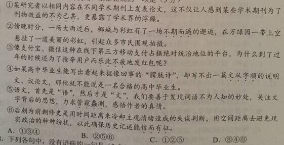 二、古代诗文阅读(35分) (一)文言文阅读(本题共4小题,19分) 阅读下面的文言文,完成10-13题。 李继宣,开封浚仪人。尝命往陕州捕虎,杀二十余,生致二虎、一豹以献。契丹寇静戎军,从崔彦进过拒马河接战,自午至申,大败之。雍熙三年,曹彬北征,继宣从先锋李继隆至方城,力战三日,大军继至,遂克固州。进壁涿州东又与敌斗乘胜攻北门克之日领轻骑度涿河觇敌势又将五千骑援米信因率劲骑追至新城北大败之斩其酋贺恩相公,继宣亦中流矢。大军还雄州取刍粮,遇契丹新城,疾战至暮。明日复战,继隆为敌所邀,继宣以所部拔之。召入,以功超授崇仪使。淳化三年,徙知保州。筑关城,浚外濠,葺营舍千五百区;造船二百艘,入鸡距泉以运粮,人咸便之。课军中劲弩,为入阵之备。至道三年,契丹寇定州,至怀德桥,继宣领兵三千掩袭之。契丹保丰隆山砦,继宣伐木治常山桥,契丹闻之,大惧,拔砦遁走。继宣锐于追袭,傅潜为部署,继宣诣潜请行,颇为所抑。及召潜属吏,诏继宣与高琼同主军事,逐敌越拒马河。受诏按视缘边城砦,权知威虏军,敌骑至城下,屡出兵设伏,斩获甚众。咸平四年,领康州刺史。敌至,继宣即召赤虏之师,敌走上羊山。继宣逐之,环山麓至其阴。继宣马连中矢毙,凡三易骑,大克捷。诏书称奖。景德初,契丹乘秋来攻,继宣独主镇州全师。及与契丹和,命为高阳关钤辖。继宣罕识字,上以河间郡事繁,虑狱讼有枉,命高继勋代之,止为钤辖。大中祥符初,召还,加四方馆使。以疾,授西京水南都巡检使,每夕罕巡警,为留司所举,特诏增巡检一员,专主夜巡。六年,疾甚,求至京师寻医,卒,年六十四。 (选自《宋史·李继宣传》) 10.下列对文中画波浪线部分的断句,正确的一项是(3分) A.进壁涿州/东又与敌斗/乘胜攻/北门克之/日领轻骑/度涿河觇敌势/又将五千骑援米信/因率劲骑追/至新城北大败之/ B.进壁涿州/东又与敌斗/乘胜攻北门/克之/日领轻骑/度涿河觇敌势/又将五千骑援/米信因率劲骑追至新城北/大败之/ C.进壁涿州东/又与敌斗/乘胜攻北门/克之/日领轻骑度涿河/觇敌势/又将五千骑援米信/因率劲骑追至新城北/大败之/ D.进壁涿州东/又与敌斗/乘胜攻/北门克之/日领轻骑度涿河/觇敌势/又将五千骑援/米信因率劲骑追/至新城北大败之/ 11.下列对文中加点词语的相关内容的解说,不正确的一项是(3分) A.地支用于计时:午时指白天十一点到一点,申时指下午三点至五点。 B.先锋,作战时率先迎敌的人或部队,后指一切事物的开创者或领先者。 C.刍粮,指供军队用的饲料和粮食。刍,本是割草,多指喂养牲畜的草。 D.属吏,指部门的下属官员,也指交给执法官吏处理。文中意思是前者。 12.下列对原文有关内容的概括和分析,不正确的一项是(3分) A.李继宣勇猛无畏,因功受封。李继宣曾受命到陕州捕捉老虎,他杀死了二十多只;后来跟随李继隆作战,斩杀敌酋,身中流矢,因战功被任崇仪使。 B.李继宣恪尽职守,积极备战。李继宣知保州时修筑城墙,修葺房舍,造船二百艘用来运粮,并且督促士兵训练使用强弩,为接下来的战斗做准备。 C.李继宣不惧牺牲,追赶敌军。李继宣任康州刺史时,勇敢迎敌,与所率军队一起紧紧追赶敌人,所骑的马多次被敌人射杀,但他继续战斗,终获胜利。 D.李继宣患病任职,深享恩典。李继宣因患病被任命为西京水南都巡检使,但每晚派遣的巡检太少,被留司举报,皇帝为此增加一名巡检,专管夜巡。 13.把文中画横线的句子翻译成现代汉语。(10分) (1)遇契丹新城,疾战至暮。明日复战,继隆为敌所邀,继宣以所部拔之。(5分) (2)继宣罕识字,上以河间郡事繁,虑狱讼有枉,命高继勋代之,止为钤辖。(5分) (二)古代诗歌阅读(本题共2小题,11分) 阅读下面这首唐诗,完成14-15题。 关山月 李端 露湿月苍苍,关头榆叶黄。 回轮照海远,分彩上楼长。 水冻频移幕,兵疲数望乡。 只应城影外,万里共胡霜。 14.下列对这首诗的赏析,不恰当的两项是(5分) A.第一句言虽简而意实多,“苍苍”突出关山“月”的特色和夜晚月色朦胧的状态。 B.第二句写关山之地榆叶尽黄,让人备感秋意,为全诗定下凄清的感情基调。 C. 第三句写月轮运转,月光皎洁,照耀着远处的大海,突出月夜的空阔明净。 D.第四句作近距离的定点描写,“上”与“长”两字写出月光的动态美与情态美。 E. 第五句写戍卒因“水冻”而不断移动帐篷,照应首句“露湿”,说明月夜露水之多。 15.最后三句表达了诗人怎样的情感?请结合诗句简要分析。(6分) (三)名篇名句默写(本题共l小题,5分) 16.补写出下列句子中的空缺部分。(5分) (1)辛弃疾《破阵子》中“ , ”两句,用数字对仗的形式描写出“沙场秋点兵”的情态。 (2)韩愈《师说》中“ , , ”三句,从如果自己比对方年幼应该向对方学习的角度讨论师道。 三、语言文字运用(20分) 17.下列各句中加点成语的使用,全都正确的一项是(3分) 某研究者以相同内容在不同学术期刊上发表论文,这不仅让人感到某些学术期刊为了刊物效益的不为已甚,更暴露了学术界的浮躁。 傍晚时分,一场大雨过后,椰城与彩虹有了一场不期而遇的邂逅,在万绿园一带上空悬挂了一道美丽的彩虹,引起众多市民围观拍摄。 像支付宝、微信这种在线下第三方移动支付占据绝对统治地位的平台,为什么到了过年的时候还为了抢夺用户而乐此不疲地发红包呢? 如果高中毕业生能写出看起来挺像回事的“朦胧诗”,却写不出一篇文从字