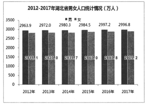 近年来湖北省男、女性别比例表(柱状图左为男性;右为女性):