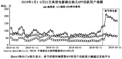 B.材料二图表显示,2018年1月1日—2月21日,淘票票APP用户活跃度一直超过其他平台。