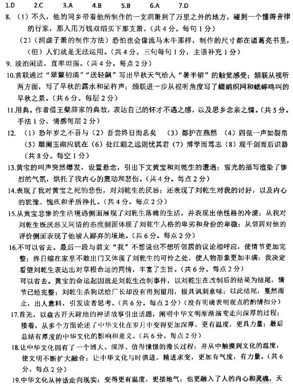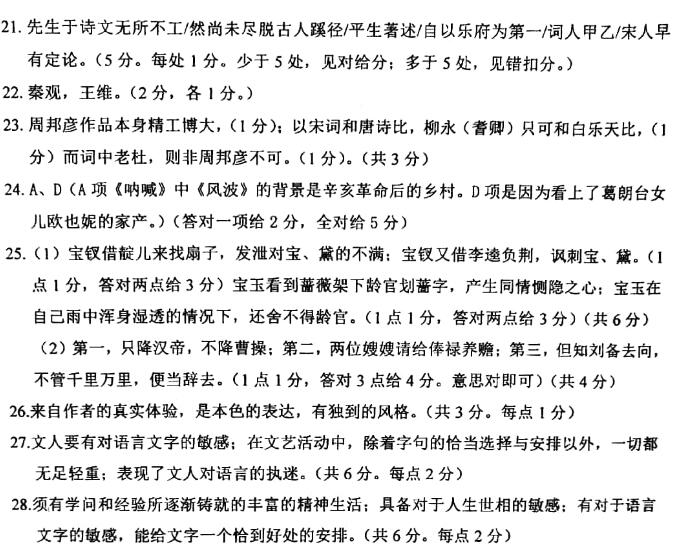 盐城市2018届高三年级第三次模拟考试 语文 附加题 (总分:40分 一、阅读材料,完居21-23题。(10分) 先生注于诗文无所不工然尚未尽脱古人蹊径平生著述自以乐府为第一词人甲乙宋人早有定论。惟张叔夏病其意趣不高远。然宋人如欧、苏、秦、黄,高则高矣,至精工博大,殊不逮先生。故以宋词比唐诗,则东坡似太白,欧、秦似摩诘,耆卿似乐天,方回、叔原则大历十子之流。南宋唯一稼轩可比昌黎,而词中老杜,则非先生不可。昔人以耆卿比少陵,未为犹当也。 (选自《人间词话》) 【注】先生:即周邦彦 21.用斜线“/”给上面文言文中的画线部分断句。(限5处)(5分) 先生于诗文无所不工然尚未尽脱古人蹊径平生著述自以乐府为第一词人甲乙宋人早有定论。 22.“欧、秦似摩诘”一句中“秦”指______,“摩诘”指__________。(2分) 23.作者认为“昔人以耆卿比少陵,未为犹当也。”的原因有哪些?请简要概括。(3分) 二、名著阅读题。(15分) 24.下列对有关名著的说明,不正确的两项是(5分) A.《呐喊》中《风波》的主人公七斤住在农村,作品给我们描绘了一幅五四时期中国农村破败的真实情景,深刻提示了危机背后的社会危机。 B.《老人与海》中的男孩曼诺林的形象与老人的形象是不可分割的,他既是老人经历的见证者,也是老人的精神传人。 C.“大英帝国的烟,日本的‘白面儿’,两大强国侍候着我一个人,这点福气还小吗?!”《茶馆》中唐铁嘴的这段话揭露了帝国主义列强对中国的经济侵略和精神毒害。 D.《欧也妮·葛朗台》中,因为看上了葛朗台女儿欧也妮的品貌,公证人克罗旭和银行家德·格拉桑经常出入葛朗台家。 E.觉新是巴金《家》中高家的第三代“觉”字辈的大少爷,觉新的亲事最终是由他父亲用拈阄的办法决定的。 25.简答题(10分) (1)《红楼梦》第30回“宝钗借扇机带双敲 (2)《三国演义》中,“屯土山关公约三事”是指哪三件事?(4分) 三、材料概括分析题(15分) 阅读材料,完成26-28题。 文学是人格的流露,一个文人先须是一个人,须有学问和经验所逐渐铸就的丰富的精神生活。有了这个基础,他让所见所闻所感所触借文字很本色地流露出来,不装腔,不作势,水到渠成,他就成就了他的独到的风格,世间也只有这种文字才算是上品文字。除着这个基点以外,如果还有什么资禀文使文人成为文人的话,依我想,一是对于人生世相的敏感。事事物物的哀乐可以变成自己的哀乐,事事物物的奥妙可以变成自己的奥妙。“一花一世界,一草一精神,”有了这种境界、自然也就有同情,就有想象,就有彻悟。其次是对于语言文字的敏感,语言文字是流通到光滑污滥的货币,可是每个字在每一个地位有它的特殊价值,丝毫增损不得,丝毫搬动不得,许多人在这上面苟且敷衍,得过且过,对于语言文字有敏感的人便觉得这是一种罪过,发生嫌憎。只有这种人才能有所谓“艺术上的良心”,也只有这种人才能真正创造文学,欣赏文学。诗人济慈说:“看一个好句如一个爱人。”在恋爱中除着恋爱以外,一切都无足轻重;在文艺活动中,除着字句的恰当选择与安排以外,也一切都无足轻重。在那一刻中(无论是恋爱或是创作文艺),全世界就只有我所经心的那一点真实,其余都是虚幻。在这两种敏感之中,对于文人,最重要的是第二种。古今有许多哲人和神秘主义的宗教家不愿用文字泄露他们的敏感,像柏拉图所说的,他们宁愿在诗里过生活、不愿意写诗。世间也有许多匹夫匹妇在幸运的时候中偶然发见生死是一件沉痛的事,或是墙角一片阴影是一幅美炒的景象,可是他们无法用语言文字把心中的感触说出来,或是说得不是那么一回事。文人的本领不只在见得到,尤其在说得出。说得出,必须说得“恰到好处”,这需要对于语言文字的敏感。有这敏感,他才能找到恰好的字,给它一个恰好的安排。 (选自朱光潜《从我怎样学国文说起》,有删改) 26.“上品文字”的特征有哪些?请依据文本简要概括。(3分) 27.“看一个好句如一个爱人”在文中的含义是什么?(6分) 28.请结合文章谈谈如何才能“使文人成为文人”。(6分) 参考答案 ![]() 人一。