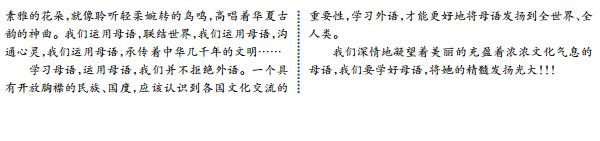 四、写作(60分) 22阅读下面的材料,根据要求写作。(60分) ①2016年,国内首档方言音乐综艺节目《十三亿分贝》在网络平台播出后,广受青年人欢迎;2017年,宣传中国方言文化的央视大型纪录片《中国话》开拍。(网络资料) ②“中国文字有三关:意美以感心,音美以感耳,形美以感目。”(鲁迅) ③“亡了国当了奴隶的人,只要牢牢记住他们的语言,就好像拿着一把打开监狱大门的钥匙。”【(法)都德】 ④德国青少年不是向德语经典作家,而是从媒体那里学习母语,使得他们“尚未成型的心灵被印上了新闻审美趣味的野蛮标记。”【(德)尼采】 ⑤联合国教科文组织将国际母语日设定在每年的2月21日,旨在促进语言和文化的多样性,以及多语种化。(网络资料) 读了上面五则材料,你有怎样的感触与思考,请以其中两三则为基础确定立意,以“我看汉语”为标题写一篇文章。要求自选角度,明确文体,不要套作,不得抄袭;不少于800字。 ![]() ![]()
