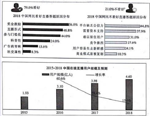 材料一:在直播平台‘靠主播表演“起家”之后,直播答题显然是迄今为止最成功的尝试。这一新鲜的娱乐活动吸引了大量用户,给各个平台带来了巨额流量和广告收入。虽然这不是“一劳永逸”的交易,活动过程中也呈现出很多问题,但我们仍能从中感受到创新的魅力。