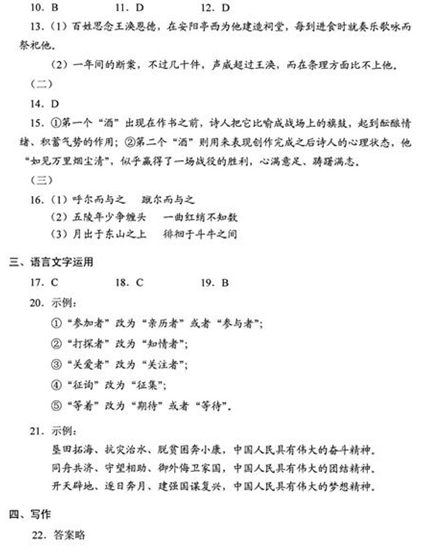 四、写作(60分) 22.阅读下面的材料,根据要求写作。(60 分) “二战”期间,为了加强对战机的防护,英美军方调查了作战后幸存飞机上弹痕的分布,决定哪里弹痕多就加强哪里。然而统计学家沃德力排众议,指出更应该注意弹痕少的部位,因为这些部位受到重创的战机,很难有机会返航,而这部分数据被忽略了。事实证明,沃德是正确的。 要求:综合材料内容及含意,选好角度,确定立意,明确文体,自拟标题;不要套作,不得抄袭:不少于800字。 参考答案 ![]()
