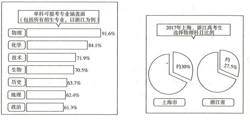 D.虽然物理可报考专业涵盖面最广,但物理学习难度大,学生缺乏学习兴趣,因此,2017年上海和浙江考生选择物理比例远不及平均值。