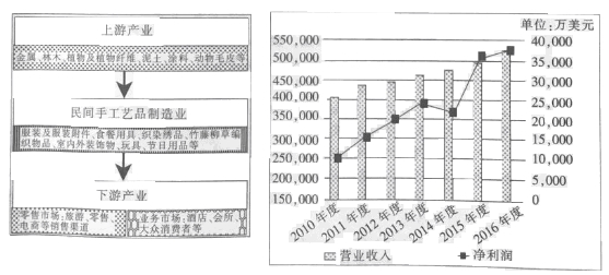 B.民间手工艺品制造业位于上游产业与下游产业之间,近五年来,无论是营业收入,还是净利润,均是一路上涨,且幅度大。