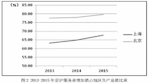 B.2015年京沪两市服务业增加值占地区生产总值比重都在65%以上,且近几年都呈不断攀升态势。