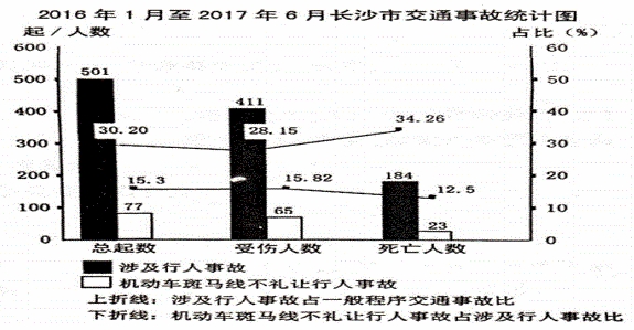 B.根据材料二统计图中的数据,我们可以看出在长沙市发生的涉及行人事故中,死亡人数超过受伤人数的三分之一。