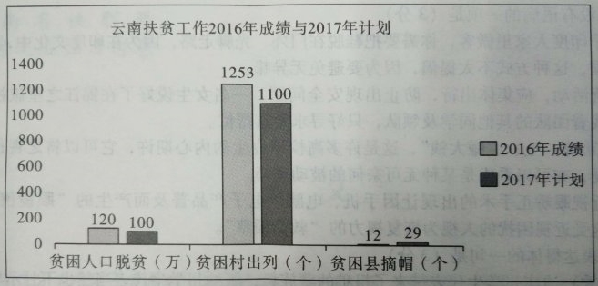 B.从材料二的图表中可以看出,云南省2017年计划脱贫的贫困人口比2016年已经脱贫的贫困人口少,由此可见2017年的扶贫工作成绩将不如2016年的好。