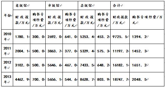 材料三:2010-2013年江西各级公共图书馆财政拨款及购书经费统计表
