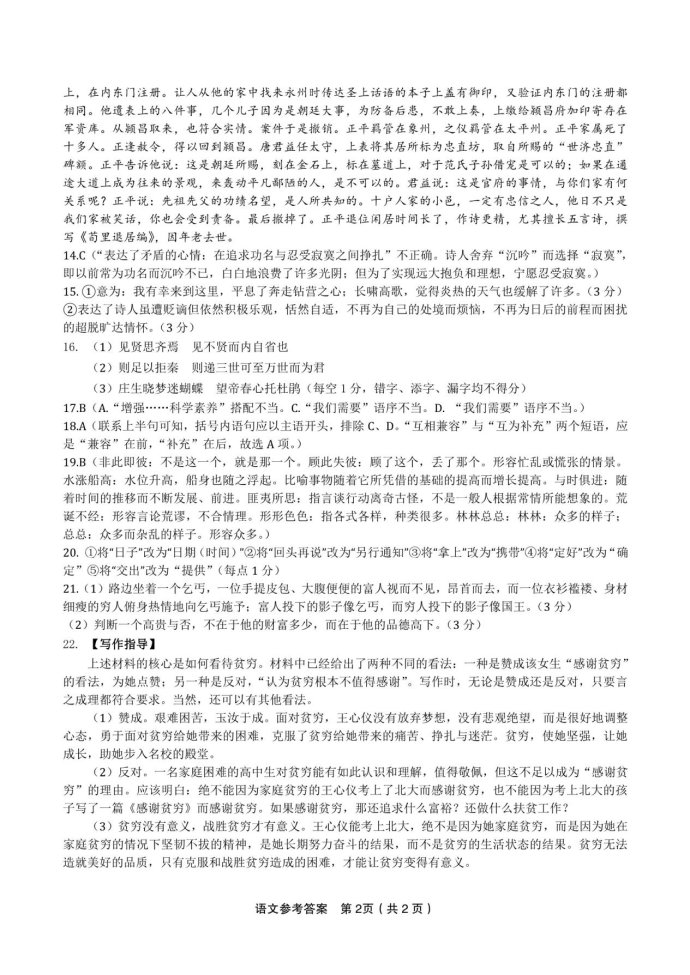 四、写作(60分) 22.阅读下面的材料,根据要求写作。(60分) 近日,一名高考取得707分、被北大中文系录取的女生王心仪写下了一篇名为《感谢贫穷》的文章,在网络热传。文中写道:“贫穷带来的远不止痛苦、挣扎与迷茫。尽管它狭窄了我的事业,刺伤了我的自尊,甚至间接带走了至亲的生命,但我仍想说,谢谢你,贫穷。”不少网友被文章打动,为这个乐现自信的姑娘点赞;也有一种反对的声音,认为贫穷根本不值得感谢。 以上材料触发了你怎样的联想和思考?请据此写一篇文章。要求:选好角度,确定立意,明确文体,自拟标题,不要套作,不得抄袭,不得泄露个人信息;不少于800字。 ![]() ![]()