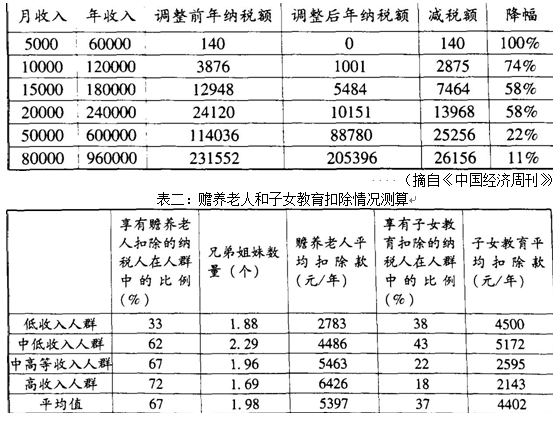 表一:个税起征点提高至每月5000元后不同收入水平的减税情况(单位:元)