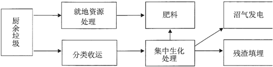 下面是某地厨余垃圾处理流程图,请把这个图转写成一段文字介绍,要求内容完整,表述准确,语言连贯,不超过90个字。(6分) 答:示例:某地对厨余垃圾采用两种处理方式:一是通过就地资源处理,化为肥料;二是经分类收运后,进行集中生化处理,制成肥料,产生的沼气用于发电,残渣则填埋处理。