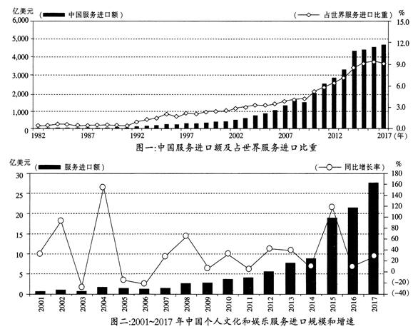 C.由图二可知,中国个人文化和娱乐服务进口额从2012年到2017年由5亿多美元上升到25亿美元以上,同比增长率在2015年约120%,仅低于2004年。
