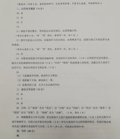 四、写作(60分) 22.阅读下面的材料,根据要求写作。(60分) 周末的晚上,一家人坐在一起闲聊,聊起幸福的话题。 奶奶说:“幸福就是吃饱穿暖,一家人团团圆圆。” 爸爸说:“幸福就是努力赚钱,有房有车,让家人生活富足。” 孩子说:“我和你们不一样。对我来说,幸福就是享受变化,体验快乐。” 每一代人的幸福都烙上了不同的时代印记。以上材料引发了你怎样的联想和思考?作为新时代的新青年,请写一篇文章,谈谈你的看法。 要求:选好角度,确定立意,明确文体,自拟标题,不要套作,不得抄袭,不得泄露个人信息;不少于800字。 ![]()