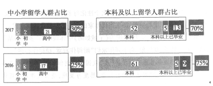 C.从材料二的图表中可以看出,2017年与2016年相比,中小学留学人群的占比量从2016年的25%已经提升到了2017年的30%,有了5个百分点的增长。
