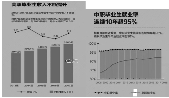 C.中职毕业学生就业率连续10年超过95%,高职毕业学生就业率从近10年来看也超过90%。月平均收入中职毕业生明显高于高职毕业生。